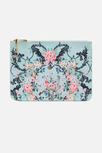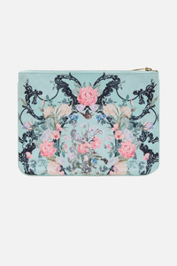 The Petal Promise Land Small Canvas Clutch delves into a garden of soft blue brimming with luscious blooms, butterflies and intricate lines of illustrative flora. Featuring a beautifully bespoke print, this luxury clutch bag showcases a streamlined rectangle silhouette adorned with contrast piped edges, a zip top enclosure, finished with a custom CAMILLA parrot clip. The internal pocket and generous main compartment keep your treasures stored in style. Explore more from the Wonderkind collection. - Lovingly Handcrafted - Designed in Australia - CAMILLA Accessories - Crystals - Tassel with parrot clip - Internal pocket - Contrast piped edge - 26cm x 18.5cm SKU 00029196-PEPROMAN-O/S Fabric and Care MAIN-100% POLYESTER ,LINING 100% VISCOSE