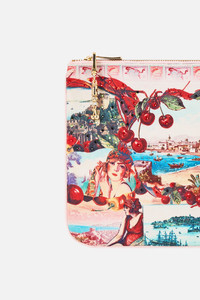 The Notes From The Road Small Canvas Clutch is a handcrafted silk silhouette designed by our in house artisans. Reimagined in an exclusive limited edition print, meticulous artisan detail meets our signature canvas clutch as finishings incorporate contrast piped edges, meticously placed crystal embellishments, zip top enclosure and a custom made parrot clip. Internal pocket and generous main compartment keep treasures stored in style. - Crystals - Removable Charm With Parrot Clip - Internal Pocket - Piped Edge - 26Cm X 18.5Cm SKU 00037534-NOTEROAD-O/S Size and Fit Our model wears a CAMILLA O/S and is 5'10 (178cm) tall. Her standard dress size is an AU 10. She has a 32in (83cm) bust, 35in (89.5cm) hips and a 25in (66cm) waist. Fabric and Care MAIN: 100% POLYESTER