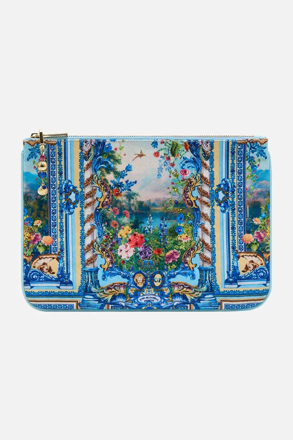 Designed in Australia, The Wall To Wall Wonders Small Canvas Clutch captures the grandeur of Queluz Palace, with soft blues and golden yellows of Azulejo tiles, blending history and artistry in a panoramic view of Portugal’s timeless beauty. Lovingly handcrafted, this CAMILLA clutch bag showcases a streamlined rectangle silhouette adorned with contrast piped edges, a zip top enclosure, and finished with a custom made parrot clip. The internal pocket and generous main compartment keep your treasures stored in style. - Crystals - Tassel With Parrot Clip - Internal Pocket - Contrast Piped Edge SKU 00034083-WALLWOND-O/S Fabric and Care MAIN: 100% POLYESTER