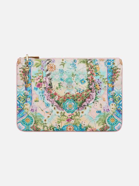 Designed in Australia, the Luscious In Lisbon Small Canvas Clutch renders tiles as stories - orange florals bloom upon a lavender haze, a canvas of vibrant ceramic artistry that echoes a timeless imagination. Lovingly handcrafted, this CAMILLA clutch bag showcases a streamlined rectangle silhouette adorned with contrast piped edges, a zip top enclosure and finished with a custom made parrot clip. The internal pocket and generous main compartment keep your treasures stored in style. - Crystals - Tassel With Parrot Clip - Internal Pocket - Contrast Piped Edge - 26CM X 18.5CM SKU 00035181-LUSCLISB-O/S Fabric and Care MAIN: 100% POLYESTER