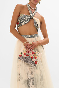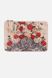 The Etched Into Eternity Small Canvas Clutch embodies a vivid arrangement of luscious florals dancing amongst a cascade of intricate filigree against a soft blush toned background. Featuring a beautifully bespoke print, this luxury clutch bag showcases a streamlined rectangle silhouette adorned with contrast piped edges, a zip top enclosure, finished with a custom CAMILLA parrot clip. The internal pocket and generous main compartment keep your treasures stored in style. Explore more from the Wonderkind collection. - Lovingly Handcrafted - Designed in Australia - CAMILLA Accessories - Crystals - Tassel with parrot clip - Internal pocket - Contrast piped edge - 26cm x 18.5cm SKU 00029195-ETCHETER-O/S Fabric and Care MAIN-100% POLYESTER ,LINING 100% VISCOSE