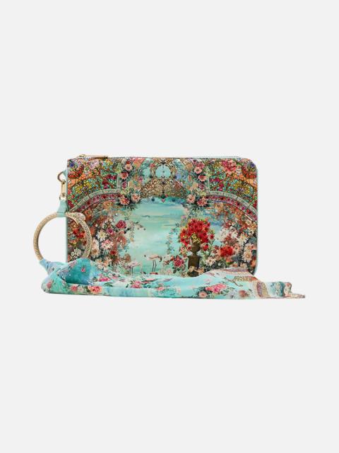 Designed in Australia, The Make Me Your Mosaic Small Canvas Clutch evokes the breathtaking tessellations that adorn the sacred walls of Egypt's architectural masterpieces Lovingly handcrafted, this CAMILLA clutch bag showcases a streamlined rectangle silhouette adorned with contrast piped edges, a zip top enclosure, and finished with a custom made parrot clip. The internal pocket and generous main compartment keep your treasures stored in style. - Crystals - Tassel With Parrot Clip - Internal Pocket - Contrast Piped Edge - 26Cm X 18.5Cm SKU 00032354-MMYMOSAC-O/S Size and Fit Our model wears a CAMILLA O/S and is 5'10 (178cm) tall. Her standard dress size is an AU 10. She has a 32in (83cm) bust, 35in (89.5cm) hips and a 25in (66cm) waist. Designed as a one size style Fabric and Care MAIN: 100% POLYESTER