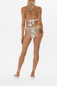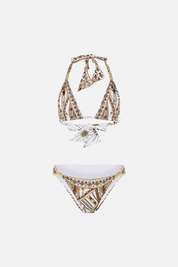 Designed in Australia, The Goddess Energy Soft Tie Bikini With Trim exudes enchantress vivacity with opulent tonal gold and metallic detailing and lotus and snake motifs, imbued on a white canvas. Lovingly handcrafted, this luxury bikini features a fitted silhouette with custom hardware details upon the straps. The bikini bottoms feature a high cut line to elongate the legs echoing matching hardware adornments. - Fits B-C Cup - Removable Soft Cups - Trim Detail On Bra Apex & Side Front Pant - Crystal Embellishment - ECONYL® Swim SKU 00034360-GODENERG-XS Size and Fit Our model wears a CAMILLA S and is 5'10 (178cm) tall. Her standard dress size is an AU 10. She has a 32in (83cm) bust, 35in (89.5cm) hips and a 25in (66cm) waist. Camilla S = AU10 / UK10 / US6 Designed and fitted true to size, take your normal size. Fabric and Care MAIN: 82% REGENERATED POLYAMIDE, 18% ELASTANE ECONYL® is regenerated nylon, crafted from waste materials that would otherwise end up polluting our Mother Earth. Its beauty lies in its ability to be recycled, remoulded and ultimately reused time and time again. An infinitely recyclable product that keeps our planet looking beautiful, it opens the door to a circular fashion sphere.