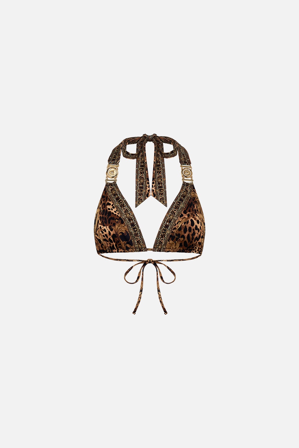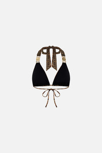 Designed in Australia, The Era Of Empires Soft Tie Tri With Trim blends architectural splendor with echoes of classical antiquity and hieroglyphs against a backdrop of decadent black and luminous gold. Lovingly handcrafted, this luxury bikini top features a triangle bust shape with adjustable tie details. With removable soft cups for added support this lavish bikini top exudes decadent wearability. - Fits B-C Cup - Removable Soft Cups - Adjustable Tie Top - Trim Detail - ECONYL® SKU 00032318-ERAOEMPS-XS Size and Fit Our model wears a CAMILLA S and is 5'10 (178cm) tall. Her standard dress size is an AU 10. She has a 32in (83cm) bust, 35in (89.5cm) hips and a 25in (66cm) waist. Camilla S = AU10 / UK10 / US6 Designed and fitted true to size, take your normal size. Fabric and Care MAIN: 82% REGENERATED POLYAMIDE, 18% ELASTANE ECONYL® is regenerated nylon, crafted from waste materials that would otherwise end up polluting our Mother Earth. Its beauty lies in its ability to be recycled, remoulded and ultimately reused time and time again. An infinitely recyclable product that keeps our planet looking beautiful, it opens the door to a circular fashion sphere.