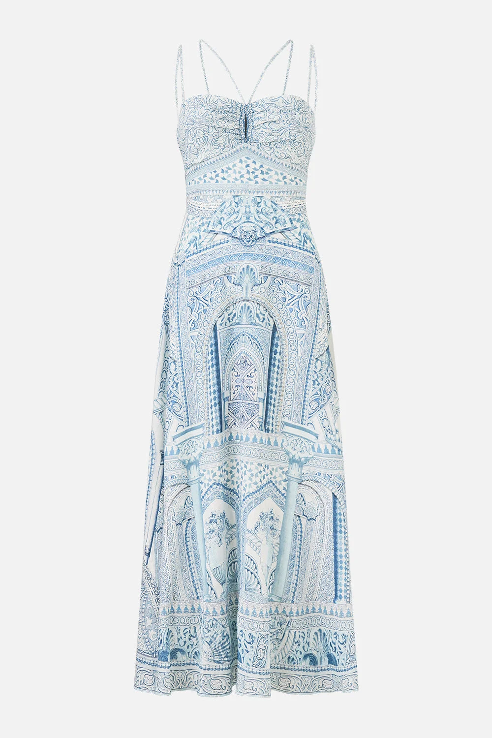 The The Hum Of The Alhambra Strap Detail Dress is a handcrafted silhouette designed by our in-house artisans. Created in an exclusive limited edition print, this linen sundress features a full-length skirt and cinched waist. Adored with signature CAMILLA crystals subtly dotted along the bust panels, this modern heirloom is accented by delicate adjustable strap ties, creating a flattering fit and flare silhouette. - 100% Linen - Long Length - Sleeveless - Full Length Skirt - Adjustable Straps - Crystal Embellishment SKU 00040441-HUMOALHA-XXS Size and Fit Our model is 5'10 (178cm) tall and wears a size S (AU 10). Bust: 40in (101.6cm) Waist: 26.5in (67cm) Hips: 38in (96.5cm) Fabric and Care 100% LINEN Made from flax fibres, this lightweight natural fibre offers a timeless aesthetic that adds durability and longevity to any wardrobe. Its breathability keeps your skin cool, minimises moisture and ensures effortless comfort.
