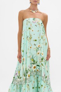 Designed in Australia, the Floral Freefall Strapless Maxi With Ruffle Hem unfolds in white florals and botanical harmony. Textiles and tapestries adorned in delicate patterns weave tales of a flower child’s paradise. Lovingly handcrafted, this maxi dress features a flared silhouette with a strapless design and optional straps. The ruffle hem adds a touch of opulence, while the invisible zip at the centre back ensures a seamless fit. - Flare Silhouette - Strapless Design With Optional Straps - Ruffle Hem - Centre Back Zip Closure SKU 00034786-FLORFREE-XXS Fabric and Care 100% SILK Silk twill is renowned for its diagonally-patterned weave and fluid texture. Its high thread count ensures rich density and durability, while its beautiful sheen provides a luscious touch to the skin.