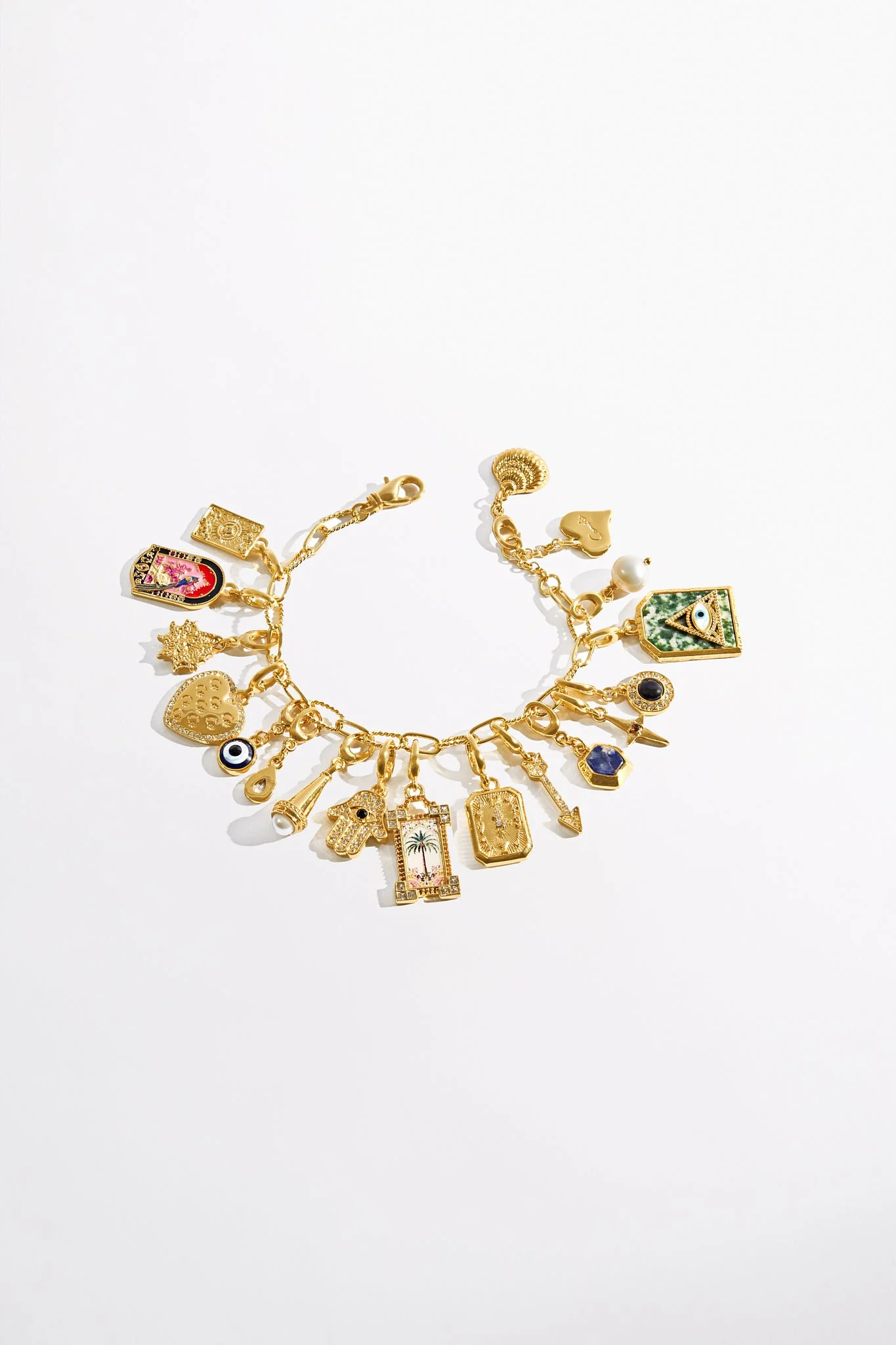 The Gold Sultans, Scribes & Shamans Charm Bracelet is a handcrafted accessory designed by our in house artisans, our charm bracelet is crafted with 18K gold plating. Embellished with enamel detailing and intricately applied gemstones, each charm is a symbol of self-expression. - 100% Metal Alloy - 18K Real Gold Plating - Solid Brass Base - Custom Design Inspired By Camilla - Bracelet - Real Cubic Zirconia - Enamel Details SKU 00041049-GOLDSUNG-O/S Fabric and Care 70% BRASS, 10% SEMI-PRECIOUS STONE, 10% CUBIC ZIRCONIA, 5% SHELL, 5% ENAMEL
