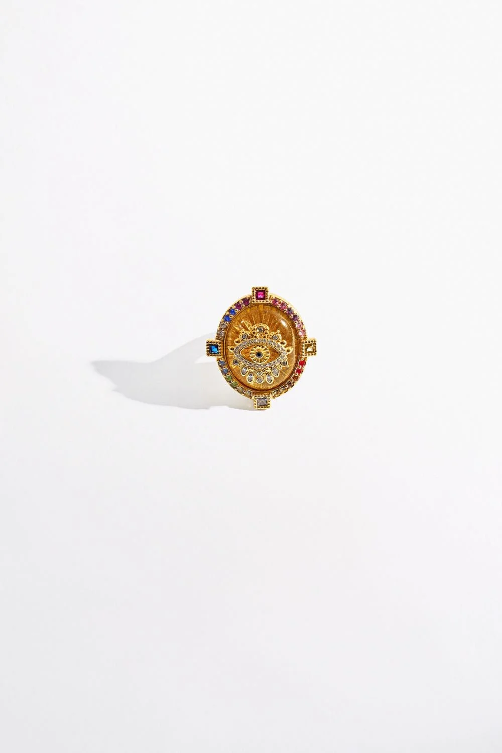 The Gold Sultans, Scribes & Shamans Eye Ring is a handcrafted accessory designed by our in house artisans and is made with 18K gold plating. Adorned with intrictately applied multicolour gemstones and engraved CAMILLA detailing around the band, it's a symbol of insight and protection. - 100% Metal Alloy - 18K Real Gold Plating - Solid Brass Base - Custom Design Inspired By Camilla - Camilla Iconography Detail Around Ring Band - Size 7 Ring - Multicolour Gemstones And Real Cubic Zirconia SKU 00041071-GOLDSUNG-O/S Size and Fit Our model wears a CAMILLA O/S and is 5'10 (178cm) tall. Her standard dress size is an AU 10. She has a 32in (83cm) bust, 35in (89.5cm) hips and a 25in (66cm) waist. Fabric and Care 80% BRASS, 10% CUBIC ZIRCONIA, 10% GLASS