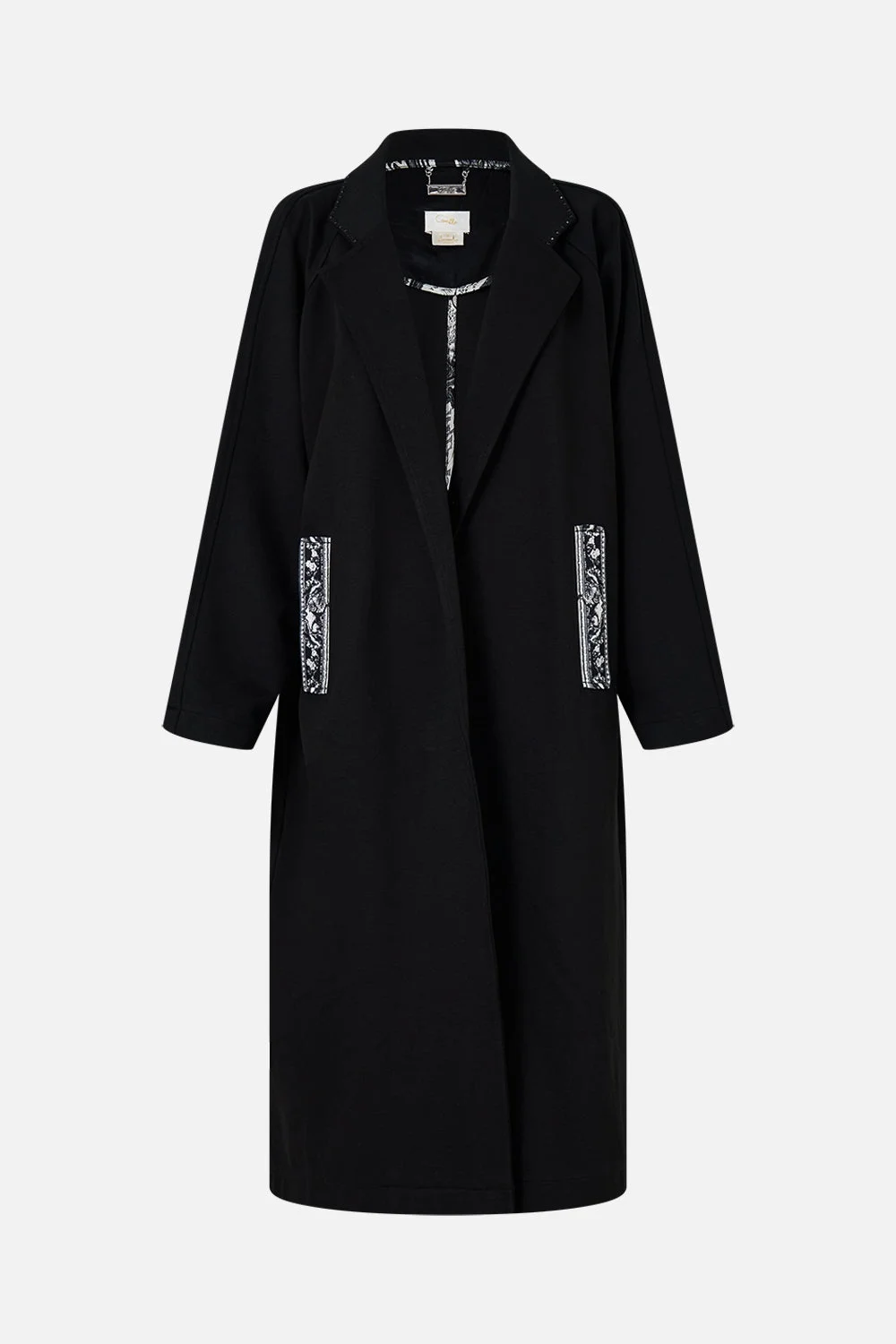 Designed in Australia, the Perfumed In Porto Sweat-Trench Coat in Black, contrast feature channels the lively allure of soap-inspired packaging with painterly designs that exude artistry and charm. Lovingly handcrafted, this sweat-trench coat reimagines casual opulence. Crystal embellishments, raglan sleeves, and functional front pockets create a polished yet relaxed outerwear statement. - Crystal Embellishment - Raglan Sleeve - Long Sleeve - Front Pockets - Crystal Embellishment - SKU 00037830-PERFPORT-XS Fabric and Care 53% COTTON, 35% MODAL, 12% LYCRA