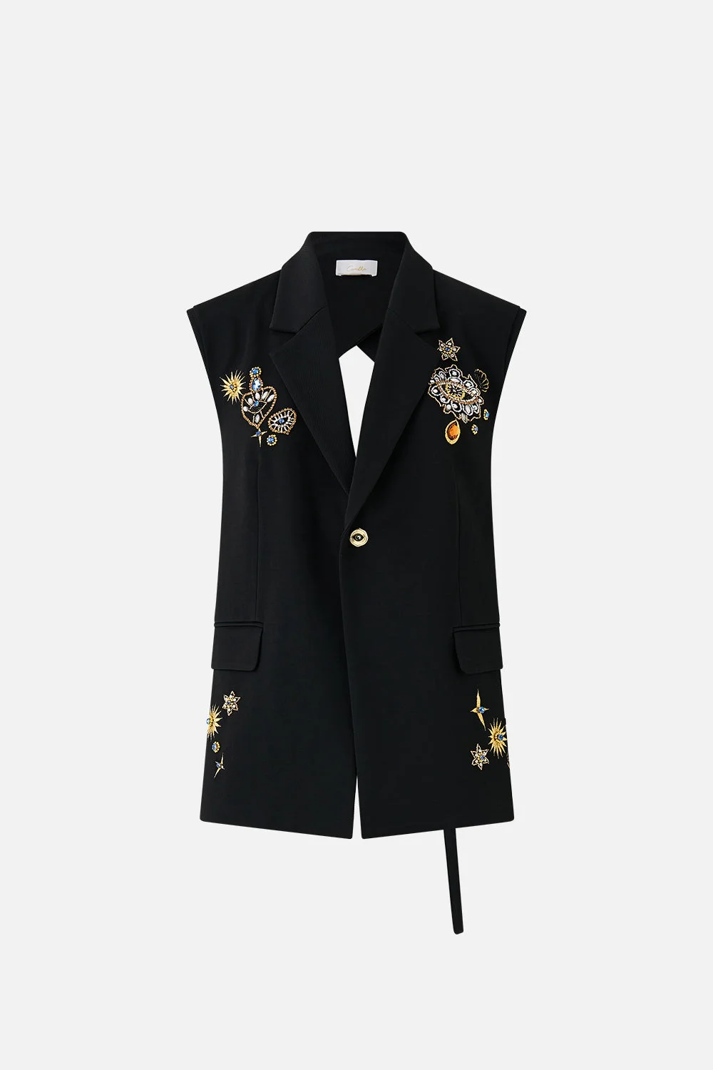 The Amulets And Alchemy Tailored Sleeveless Vest is a handcrafted silhouette designed by our in house artisans. Reimagined in an exclusive limited edition print, this luxury sleeveless blazer is cut in a tailored fit with a lapel collar and front button fastening. It features an open back detail with tab belt fastening for versatility and is finished with intricately placed crystal embellishments, for luminous detail. - Lapel Collar - Open Back Detail - Back D-Ring Tab Belt - Front Button Fastening - Hand Embellishment Detail SKU 00038421-AMULALCH-XXS Size and Fit Our model is 5'10 (178cm) tall and wears a size S (AU 10). Bust: 40in (101.6cm) Waist: 26.5in (67cm) Hips: 38in (96.5cm) Fabric and Care 64% RAYON 31% POLYESTER 5% ELASTANE