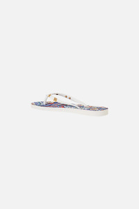 Designed in Australia, the Tiles Darls Thongs reads the language of florals and tiles, blue and orange hues intertwine, a celebration of artisan hands and enduring beauty. Lovingly handcrafted, these luxury thongs are home to the iconic CAMILLA namesake in golden hues and metallic hardware detailing, a comfortable fit and timeless strap that crosses along the foot for lavish wearability. - Printed CAMILLA - Contrast Toe Rubber - Crystal/Stud - CAMILLA Logo SKU 00035857-TILEDARL-35/36 Fabric and Care UPPER: RUBBER, SOLE: RUBBER
