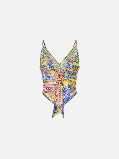 Designed in Australia, the Spirit Of Santa Maria Tie Back Cami dances in pastel hues and vibrant painterly graphics, inspired by the electric beauty of Igreja Matriz De Santa Maria and its radiant frescoes. Lovingly handcrafted, this fitted tie-back cami, crafted in hip-length design features adjustable spaghetti straps and a keyhole back, offering a blend of tailored elegance and modern allure for versatile styling. - Fitted Style - Hip Length - Adjustable Straps - Jersey Bralette Back SKU 00035872-SPIRMARI-XXS Fabric and Care 100% SILK Silk twill is renowned for its diagonally-patterned weave and fluid texture. Its high thread count ensures rich density and durability, while its beautiful sheen provides a luscious touch to the skin.
