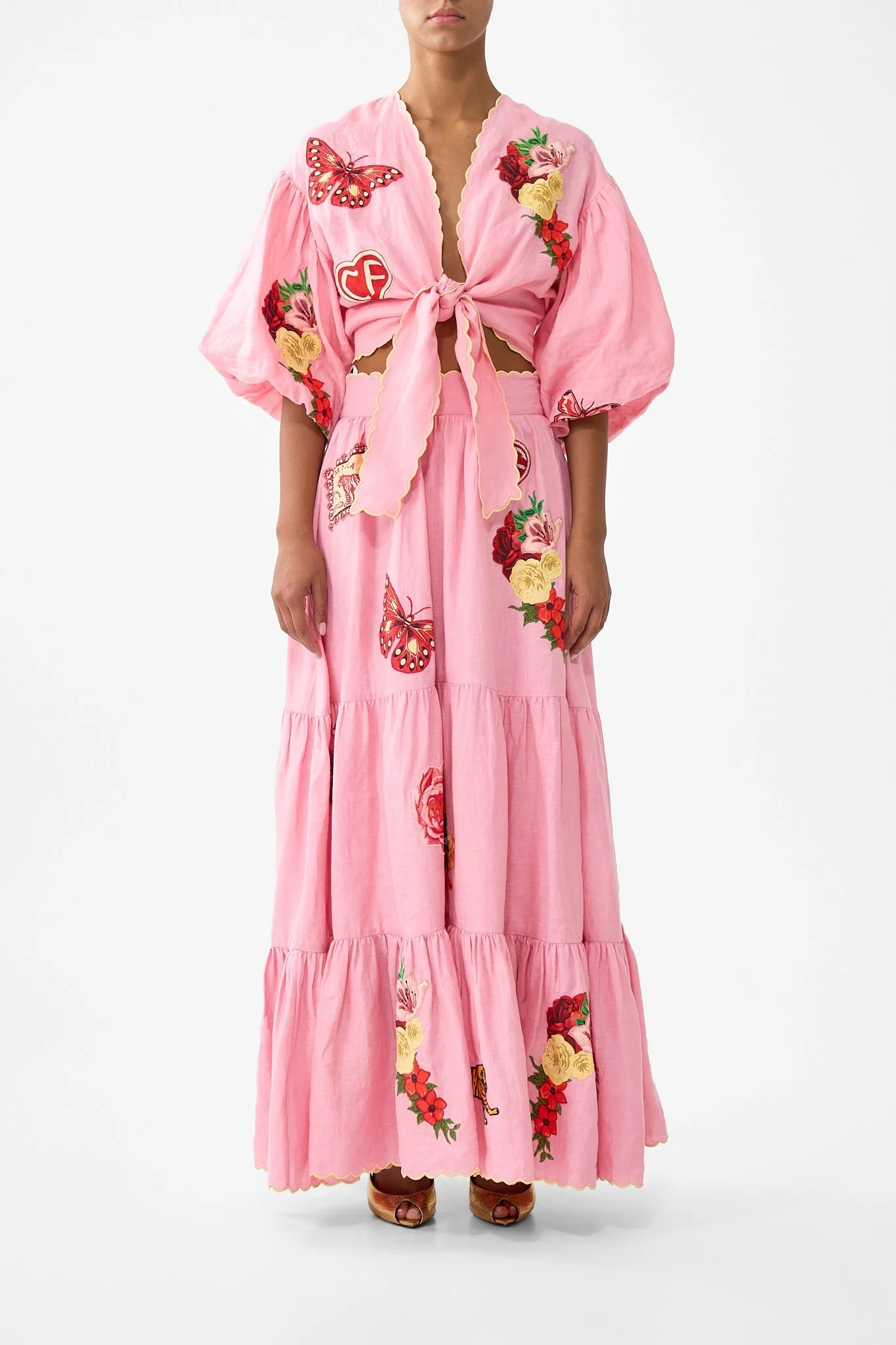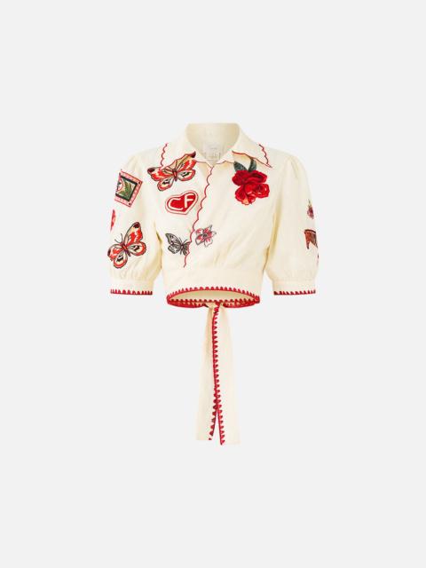 The Collage Kingdom Tie Front Puff Sleeve Top is a handcrafted silhouette designed by our in house artisans. Reimagined in an exclusive limited edition print, this cropped top is cut in a relaxed fit and finished with generous puff sleeves that fall to the elbow. An adjustable tie front draws in the waist, creating a flattering shape that balances ease with statement detail. - 100% Linen - Relaxed Fit - Cropped Length - Half Length Puff Sleeve - Tie Front Design SKU 00038333-COLLKING-XXS Size and Fit Our model is 5'10 (178cm) tall and wears a size S (AU 10). Bust: 40in (101.6cm) Waist: 26.5in (67cm) Hips: 38in (96.5cm) Designed and fitted true to size, take your normal size. Fabric and Care 100% LINEN Made from flax fibres, this lightweight natural fibre offers a timeless aesthetic that adds durability and longevity to any wardrobe. Its breathability keeps your skin cool, minimises moisture and ensures effortless comfort.