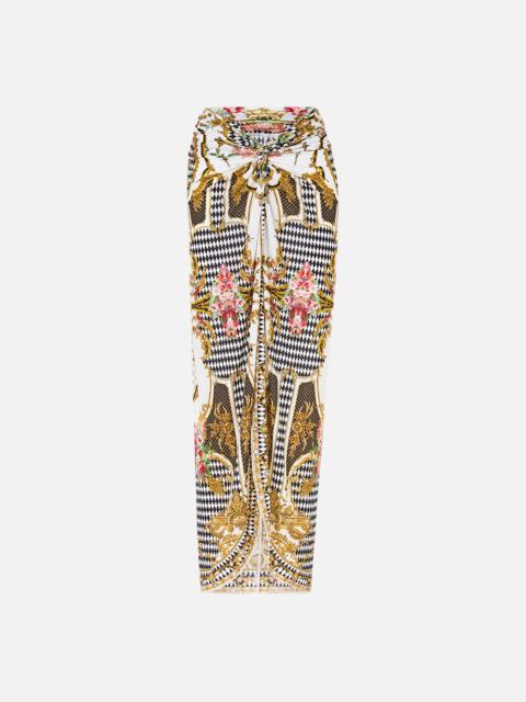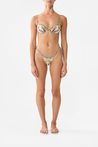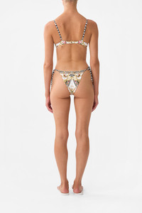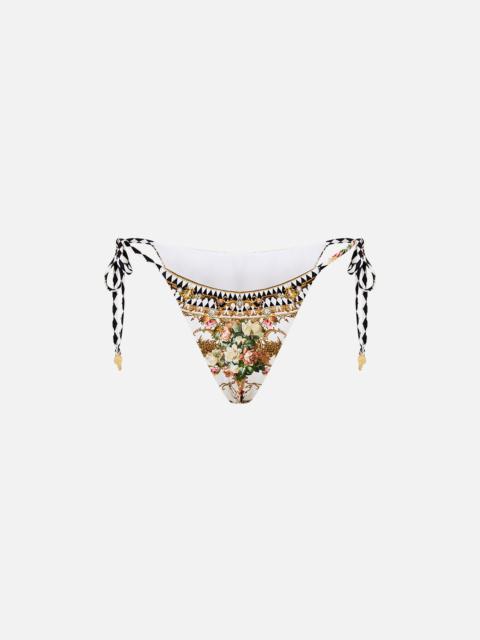 Designed in Australia, The Rococo Glow Tie Side Skimpy Pant features framed florals, ornate borders, and intricate ceiling and floor details that capture the regal elegance of the Palace of Queluz. Lovingly handcrafted, this luxury bikini bottom is crafted from sustainable materials and features a fitted silhouette with adjustable side ties. The dipped waistline and high-cut legs create a sensually skimpy line that elongates the legs. - Skimpy Bottom Coverage - Side Ties - Dipped Waist - High Leg - Crystal Embellishment - ECONYL® swim SKU 00034127-ROCOGLOW-XS Size and Fit Our model wears a CAMILLA S and is 5'10 (178cm) tall. Her standard dress size is an AU 10. She has a 32in (83cm) bust, 35in (89.5cm) hips and a 25in (66cm) waist. Camilla S = AU10 / UK10 / US6 Designed and fitted true to size, take your normal size Fabric and Care MAIN: 82% REGENERATED POLYAMIDE, 18% ELASTANE ECONYL® is regenerated nylon, crafted from waste materials that would otherwise end up polluting our Mother Earth. Its beauty lies in its ability to be recycled, remoulded and ultimately reused time and time again. An infinitely recyclable product that keeps our planet looking beautiful, it opens the door to a circular fashion sphere.