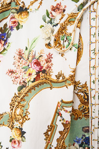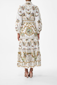 Designed in Australia, the Dressing Room Drama Tiered Long Shirt Dress unveils a black base fused with florals and gilded arches, echoing the regal opulence of the Palace of Queluz—a poetic nod to throne rooms and the queen's dressing sanctuary. Lovingly handcrafted, this lavish maxi dress features a relaxed fit throughout the body into a flowy tiered full length skirt. Paired with a soft tailored collar, button front detail and blouson sleeves, this CAMILLA shirt dress exudes luxury. - Button Through Front - Blouson Sleeve - Waist Tie - Crystal Embellishment SKU 00035683-DRESDRAM-XXS Fabric and Care 100% ORGANIC COTTON Organic cotton poplin is sumptuously smooth with a crisp, refined weave. This lightweight silken fabric drapes beautifully and is ideal for sleek contours and tailored, defined styles.