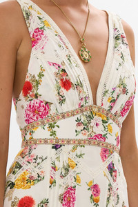 Designed in Australia, The Egyptian Rose Tiered Ruffle Hem Dress captures an enchanting oasis where lush florals entwine with majestic interiors amid a serene, pearlescent setting. Lovingly handcrafted, this luxury silk maxi dress is a true vision, featuring signature CAMILLA embellished crystals that catch the light with every step. The plunge neckline falls into a shaped waistband flowing into full length skirt of tiered ruffles to create an exceptional CAMILLA silk maxi dress made for seamless transition from decadent daywear into evening elegance. - V Neckline - Shaped Waistband - Tiered Ruffle Skirt - Crystal Embellishment - Slim fit SKU 00031533-EGYPROSE-XXS Size and Fit Our model wears a CAMILLA S and is 5'10 (178cm) tall. Her standard dress size is an AU 10. She has a 32in (83cm) bust, 35in (89.5cm) hips and a 25in (66cm) waist. Camilla S = AU10 / UK10 / US6 Designed and fitted true to size, take your normal size. Fabric and Care SELF-70% COTTON, 30% SILK, LINING -80% COTTON, 20% SILK