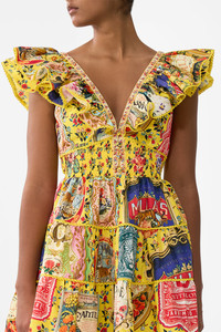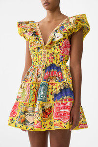 Designed in Australia, the Soap Opera Tiered Short Dress With Neck Frill unfolds colourful painterly prints inspired by handcrafted soap packaging—a sensory journey of bespoke artistry and vibrant design. Lovingly handcrafted, this CAMILLA ruffle mini dress showcases a fitted bodice that gracefully transitions into a beautifully shaped shirred waistband. The full skirt dons a cascade of gathered tiers finished with a wide ruffle hemline, crafting an playful short dress. - Fitted Waist With Adjustable Tie Back - Short Length - Deep V Button Neck With Optional Modesty Clip - Crystal Embellishment - SKU 00035821-SOAPOPER-XXS Size and Fit Our model wears a CAMILLA S and is 5'10 (178cm) tall. Her standard dress size is an AU 10. She has a 32in (83cm) bust, 35in (89.5cm) hips and a 25in (66cm) waist. Camilla S = AU10 / UK10 / US6 Designed and fitted true to size, take your normal size. Fabric and Care 100% ORGANIC COTTON Organic cotton poplin is sumptuously smooth with a crisp, refined weave. This lightweight silken fabric drapes beautifully and is ideal for sleek contours and tailored, defined styles.