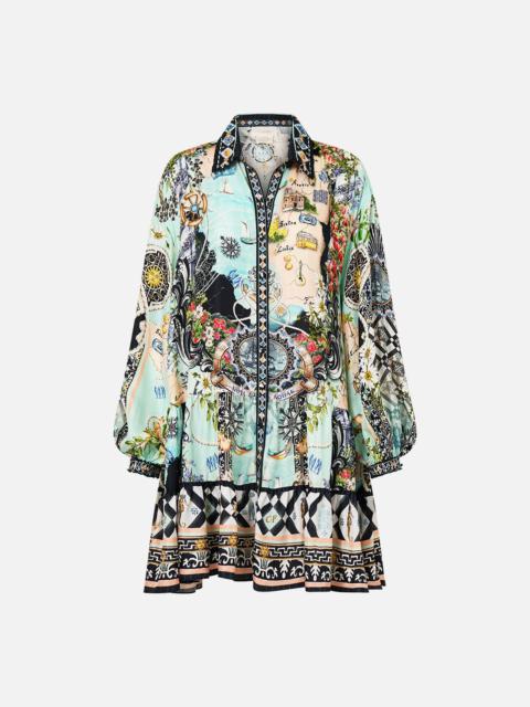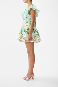 Designed in Australia, the Floral Freefall Tiered Short Dress With Neck Frill floats on a dreamscape of baby blue and purple. Botanical motifs cascade across embroidered textiles, capturing the poetry of wildflower fields. Lovingly handcrafted, this CAMILLA ruffle mini dress showcases a fitted bodice that gracefully transitions into a beautifully shaped shirred waistband. The full skirt dons a cascade of gathered tiers finished with a wide ruffle hemline, crafting a charming short dress. - Fitted Waist With Adjustable Tie Back - Short Length - Deep V Button Neck With Optional Modesty Clip - Double Layer Neck Frill With Lace Trim SKU 00035363-FLORFREE-XXS Size and Fit Our model wears a CAMILLA S and is 5'10 (178cm) tall. Her standard dress size is an AU 10. She has a 32in (83cm) bust, 35in (89.5cm) hips and a 25in (66cm) waist. Camilla S = AU10 / UK10 / US6 Designed and fitted true to size, take your normal size. Fabric and Care 100% LINEN Made from flax fibres, this lightweight natural fibre offers a timeless aesthetic that adds durability and longevity to any wardrobe. Its breathability keeps your skin cool, minimises moisture and ensures effortless comfort.