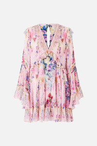 The Palatial Pastels Tiered Swing Mini Dress is a handcrafted silhouette designed by our in house artisans. Reimagined in an exclusive limited edition print, this sumptuous swing dress is relaxed fitting and falls to an asymmetric, mini length hemline. It features a V neckline that is adorned with generous long sleeves and is elevated by delicate lace trim details throughout. - 100% Silk - V Neckline - Short Length - Volume Sleeve - Relaxed Fit - Lace Trims SKU 00038606-PALAPAST-XS Size and Fit Our model is 5'10 (178cm) tall and wears a size S (AU 10). Bust: 40in (101.6cm) Waist: 26.5in (67cm) Hips: 38in (96.5cm) Fabric and Care 100% SILK