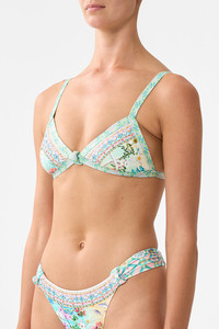 Designed in Australia, the Just Coasting Knot Front Triangle Bra radiates a kaleidoscope of pastel dreams, sunlit charm and coastal treasures inspired by boundless seaside reveries. Lovingly handcrafted, this knot front tri bra blends comfort with allure. Designed for B-C cups featuring a centre front knot, adjustable convertible straps and shimmering crystal embellishments for added sparkle. - To Suit B-C Cup - Centre Front Knot Detail - Adjustable And Convertible Straps - Crystal Embellishment - ECONYL® sustainable fabric SKU 00035499-JUSTCOAS-XS Size and Fit Our model wears a CAMILLA S and is 5'10 (178cm) tall. Her standard dress size is an AU 10. She has a 32in (83cm) bust, 35in (89.5cm) hips and a 25in (66cm) waist. Camilla S = AU10 / UK10 / US6 Fabric and Care MAIN: 82% REGENERATED POLYAMIDE, 18% ELASTANE ECONYL® is regenerated nylon, crafted from waste materials that would otherwise end up polluting our Mother Earth. Its beauty lies in its ability to be recycled, remoulded and ultimately reused time and time again. An infinitely recyclable product that keeps our planet looking beautiful, it opens the door to a circular fashion sphere.