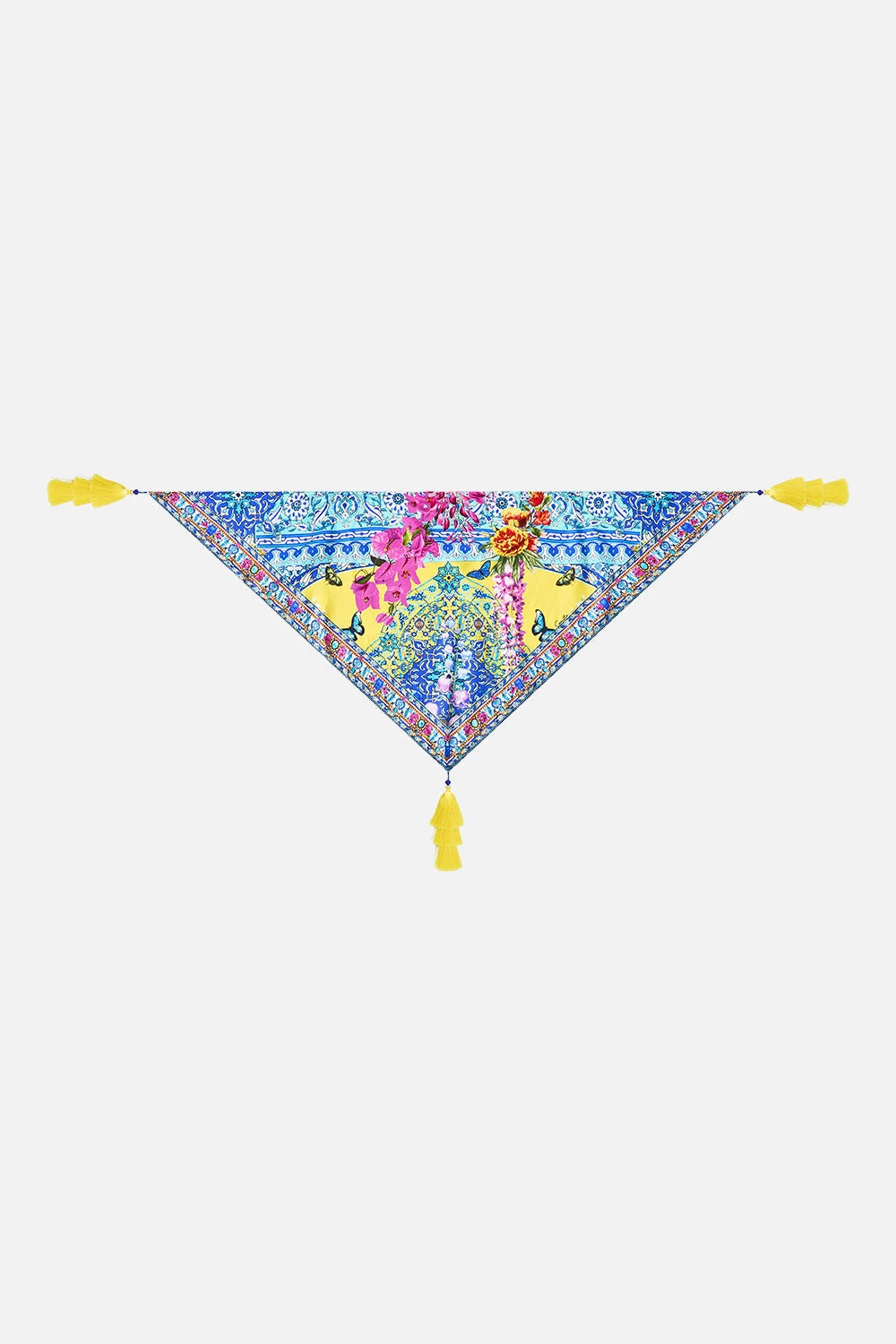 The Sultanahmet Summer Triangle Scarf With Tassels is a handcrafted silk silhouette designed by our in house artisans. Reimagined in an exclusive limited edition print, our triangle shaped scarf features large tassels and intricately applied crystal embellishments. - 100% Silk - Camilla Printed - Crystals - Large Tassels - Triangle Shape - 97cm X 45cm SKU 00039290-SULTSUMM-O/S Size and Fit Our model wears a CAMILLA O/S and is 5'10 (178cm) tall. Her standard dress size is an AU 10. She has a 32in (83cm) bust, 35in (89.5cm) hips and a 25in (66cm) waist. Fabric and Care MAIN: 100% SILK
