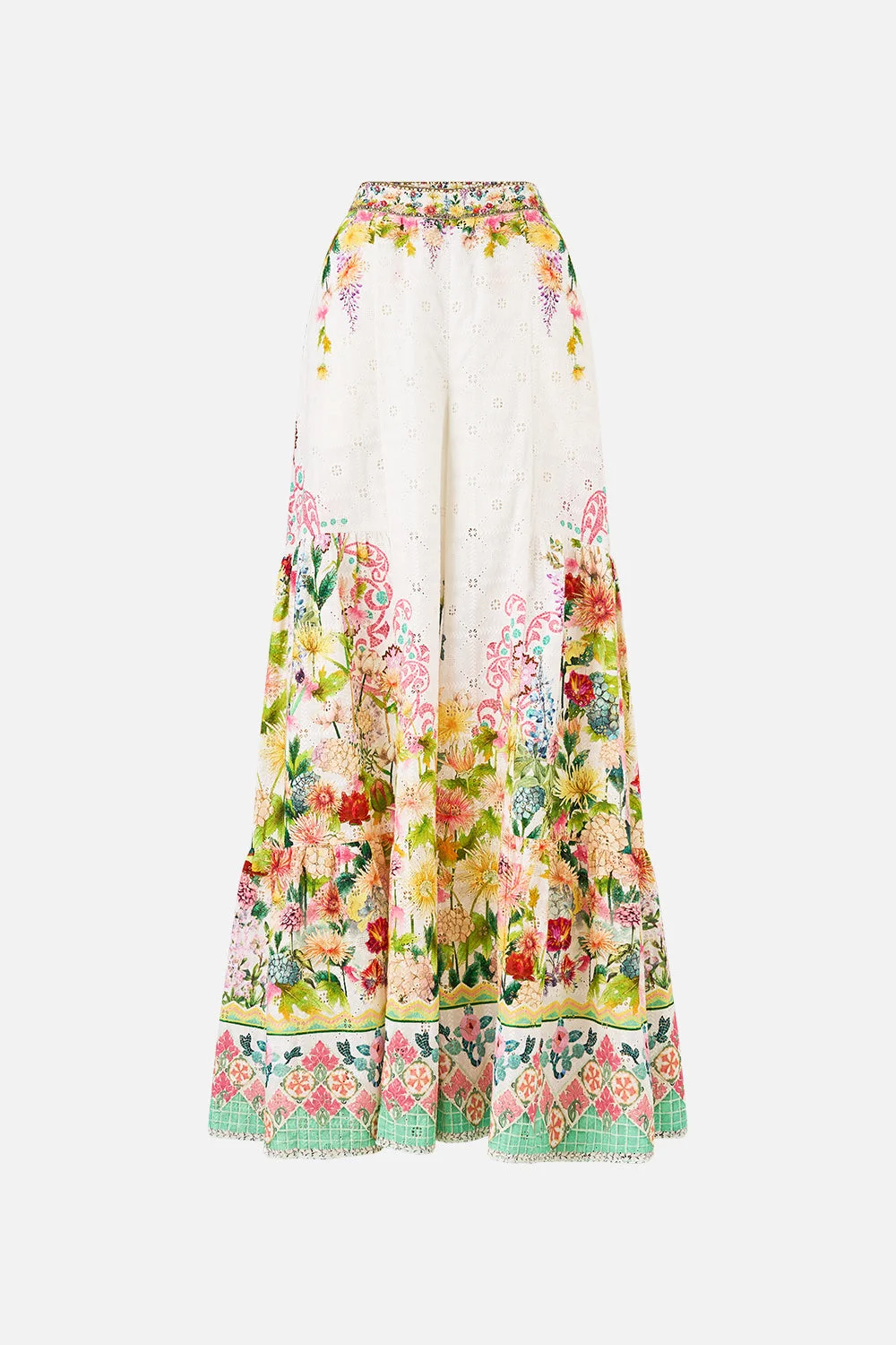 The The Call Of Catalonia Trouser With Tiered Panels is a handcrafted silhouette designed by our in-house artisans. Envisioned in an exclusive limited edition print, these full length pants exude effortless wearability with a relaxed fit. An elasticated waistband falls into a flared leg before being finished with subtle side pockets and intricately applied crystal embellishments. - 100% Cotton - Flat Waistband At Front - Elasticated Waistband At Back - Side Seam Zipper And Pockets - Crystal Embellishment - Gathered Panels - Embroidered Details SKU 00040975-CALLCATA-XXS Size and Fit Our model is 5'10 (178cm) tall and wears a size S (AU 10). Bust: 40in (101.6cm) Waist: 26.5in (67cm) Hips: 38in (96.5cm) Fabric and Care 100% COTTON