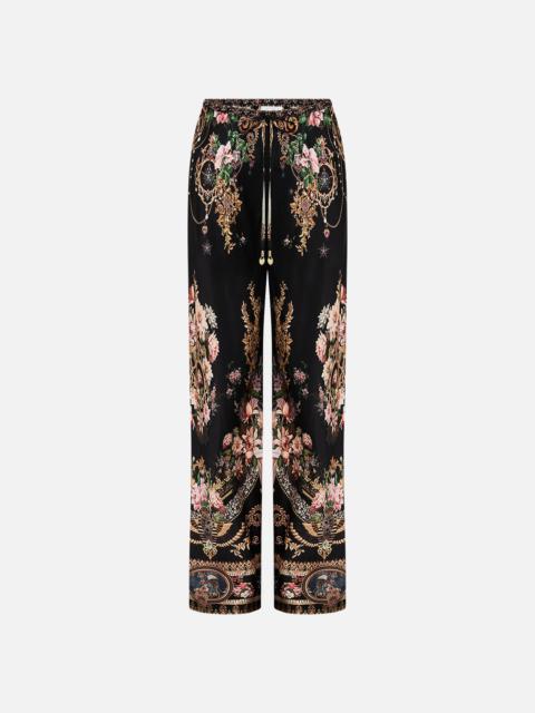 Designed in Australia, The Obelisk Gate Tuck Front Pant unearths the opulence of Dendera and Hatshepsut’s divine legacy. Adorned with heiroglyphs, majestic golden arches, and the Eye of Horus set against a rich burnt sunset backdrop Lovingly handcrafted, these uxury silk pants are designed with a side leg silhouette and finished with an elasticated waistband and side seam pockets for effortless wearability. With generous tuck front details these pants create a dramatic billow with every step. - Relaxed Fit - Full Length - Elasticated Waist - Wide Leg - Crystal Embellishment SKU 00032068-OBELGATE-XS Size and Fit Our model wears a CAMILLA S and is 5'10 (178cm) tall. Her standard dress size is an AU 10. She has a 32in (83cm) bust, 35in (89.5cm) hips and a 25in (66cm) waist. Camilla S = AU10 / UK10 / US6 Fabric and Care 100% silk Silk twill is renowned for its diagonally-patterned weave and fluid texture. Its high thread count ensures rich density and durability, while its beautiful sheen provides a luscious touch to the skin.