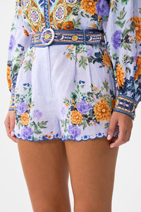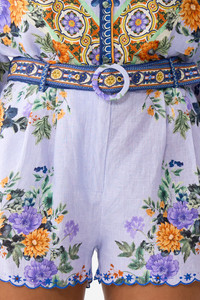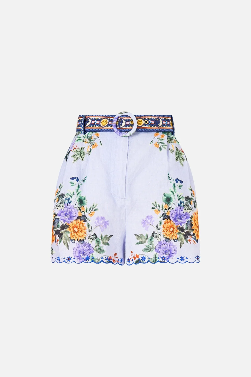Designed in Australia, the Luscious In Lisbon Tuck Front Short renders tiles as stories - orange florals bloom upon a lavender haze, a canvas of vibrant ceramic artistry that echoes a timeless imagination. Lovingly handcrafted, these luxury linen shorts showcase a sumptuous fit and high waisted silhouette. The subtle A-line flare is accompanied with pocket details for effortless elegance and soft tailored wearability. - High Waisted - Tucks At Front - Zipper + Button Closure - Removable Belt - Crystal Embellishment - SKU 00037935-LUSCLISB-XXS Size and Fit Our model wears a CAMILLA S and is 5'10 (178cm) tall. Her standard dress size is an AU 10. She has a 32in (83cm) bust, 35in (89.5cm) hips and a 25in (66cm) waist. Camilla S = AU10 / UK10 / US6 Designed and fitted true to size, take your normal size. Fabric and Care 100% LINEN Made from flax fibres, this lightweight natural fibre offers a timeless aesthetic that adds durability and longevity to any wardrobe. Its breathability keeps your skin cool, minimises moisture and ensures effortless comfort.