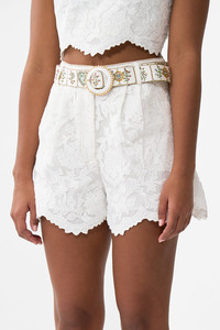 Designed in Australia, the Dressing Room Drama Tuck Front Short embodies a white base fused with florals and golden arches, inspired by the arabesque opulence of the Palace of Queluz and its storied princess chambers. Lovingly handcrafted, these luxury shorts showcase a sumptuous fit and high waisted silhouette. The subtle A-line flare is accompanied with pocket details for effortless charm and soft tailored wearability. - Waistband - Tucks At Front - Embroidered Lace Fabric - Removable Belt - Crystal Embellishment - SKU 00035514-DRESDRAM-XXS Size and Fit Our model wears a CAMILLA S and is 5'10 (178cm) tall. Her standard dress size is an AU 10. She has a 32in (83cm) bust, 35in (89.5cm) hips and a 25in (66cm) waist. Camilla S = AU10 / UK10 / US6 Designed and fitted true to size, take your normal size. Fabric and Care SELF-65% COTTON, 35% POLYESTER, CONTRAST-100% COTTON AND LINING-100%COTTON