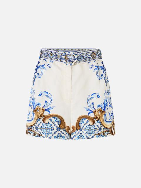 Designed in Australia, The Azul Adventures Tuck Front Short echoes the rich blue and yellow hues of Queluz Palace's artwork, featuring hand-painted motifs and scenes of Portuguese life, a tribute to Leho tilework and ceramic storytelling. Lovingly handcrafted, these luxury shorts showcase a sumptuous fit and high waisted silhouette. The subtle A-line flare is accompanied with pocket details for effortless elegance and soft tailored wearability. - Wasitband - 2 X Tucks At Front - Zipper + Button Closure - Removable Belt - Crystal Embellishment - Non-Sheer SKU 00033722-AZULADVT-XXS Size and Fit Designed and fitted true to size, take your normal size Fabric and Care SELF:62% VISCOSE, 22% LINEN, 16% RAYON / CONTRAST:100% COTTON Viscose-linen blends are known for their softness, breathability and drape—made perfect for lightweight soft tailored silhouettes or more structured styles in heavier weights.