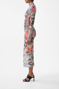 Designed in Australia, the Flower Showers Turtle Neck Mesh Dress unfolds colourful painterly prints inspired by handcrafted soap packaging—a sensory journey of bespoke artistry and vibrant design. Lovingly handcrafted, this luxury jersey midi dress features a high neckline with a fitted silhouette throughout the body. The slim full length sleeves echo the streamlined silhouette while the back zip and split ensure sleek wearability. - Fitted Body - Midi Length - Turtle Neck - Crystal Embellishment SKU 00035698-FLOWSHOW-XS Size and Fit Our model wears a CAMILLA S and is 5'10 (178cm) tall. Her standard dress size is an AU 10. She has a 32in (83cm) bust, 35in (89.5cm) hips and a 25in (66cm) waist. Camilla S = AU10 / UK10 / US6 Designed and fitted true to size, take your normal size. Fabric and Care 96% RAYON, 4% SPANDEX'