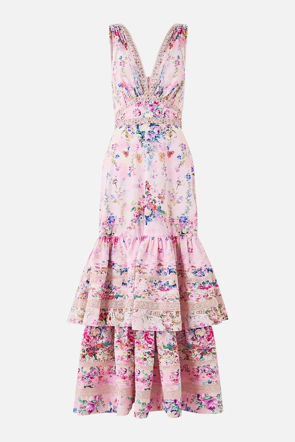 The Palatial Pastels Two Tiered Gathered Ruffle Dress is a handcrafted silhouette designed by our in house artisans. Reimagined in an exclusive limited edition print, this divine longline dress features a deep V neckline framed by adjustable halter neck ties. Its shaped waistband melts into a tiered skirt that is adorned with delicate lace inserts, adding romantic movement with every step. - 100% Organic Cotton - V Neckline - Long Length - Halter Neck Tie - Shaped Waistband - Tiered Skirt - Lace Inserts SKU 00041077-PALAPAST-XS Size and Fit Our model is 5'10 (178cm) tall and wears a size S (AU 10). Bust: 40in (101.6cm) Waist: 26.5in (67cm) Hips: 38in (96.5cm) Fabric and Care 100% ORGANIC COTTON
