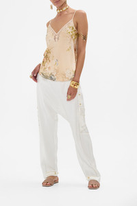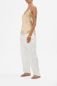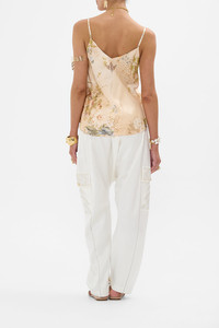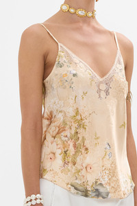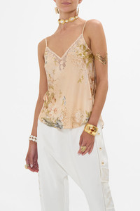 Fabricated with breathtaking precision and awe inspiring luxury, this collector's treasure is a CAMILLA best-selling creation. The Adorned In Antiquity V-Neck Bias Cami moves through opulent archways adorned with soft nude tones of leopard print highlights entwined with delicate florals and decorative golden fronds. A luxury silk cami with a bias cut shape that skims the curves and falls into soft flowing curved hemlines at the front and back. The chic v front and back neckline paired with adjustable straps exude elegant wearability. - Lovingly Handcrafted - Designed in Australia - CAMILLA Ready-To-Wear - Crystal embellishment - V front neckline - V back neckline - Adjustable shoulder straps - Bias cut silhouette - Curved hemlines - Can be worn as a matching set SKU 00033019-ADOANTIQ-XS Size and Fit Our model wears a CAMILLA S and is 5'10 (178cm) tall. Her standard dress size is an AU 10. She has a 32in (83cm) bust, 35in (89.5cm) hips and a 25in (66cm) waist. Camilla S = AU10 / UK10 / US6 Designed true to size, take your normal size Fabric and Care 100%SILK (CHARMEUSE) Silk satin embodies a sumptuously smooth finish that offers a rich buttery touch to the skin. As a result of the satin weaving technique, it masterfully creates a fuller bounce to the body and drape details.