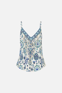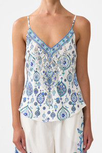 The Isnik Lullaby V-Neck Bias Cami is a handcrafted silk silhouette designed by our in house artisans. Reimagined in an exclusive limited edition print, our embellished cami features a plunging V neckline and low back cut. While adjustable straps ensure a tailored fit, crystal embellishment add the finishing touch. - 100% Silk - Bias Cut - Crystal Embellishment - Adjustable Straps - Low Back SKU 00037318-ISNILULL-XXS Size and Fit Our model is 5'10 (178cm) tall and wears a size S (AU 10). Bust: 40in (101.6cm) Waist: 26.5in (67cm) Hips: 38in (96.5cm) Designed and fitted true to size, take your normal size. Fabric and Care 100% SILK With its subtly textured surface, silk crepe is our core fabrication made perfect for versatile wear. With its ability to hold alternative ways to wear, this decadent fabric drapes elegantly off the body whilst keeping you cool with its breathable nature.