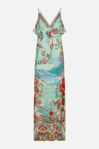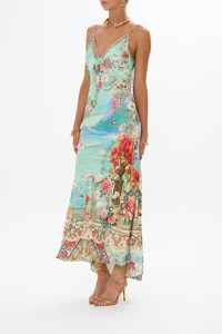 Fabricated with breathtaking precision and awe inspiring luxury, this collector's treasure is a CAMILLA best-selling creation. Designed in Australia, The Jewellery Museum V Neck Bias Slip Dress With Back Frill weaves together the opulent mystique of Alexandria’s hidden treasures with sumptuous florals and the richness of azure skies, crafting a serene valley brimming with elegance. Lovingly handcrafted, this CAMILLA silk dress features a bias cut shape that skims beautifully across the curves of the body into a full-length hemline. The deep V back neck and delicate adjustable shoulder straps exude unparalleled opulence. - Bias Cut - Bust Darts - Rouleau Straps - Machine Embroidery On Back Frill - V neckline SKU 00031368-JEWLMUSE-XXS Size and Fit Our model wears a CAMILLA S and is 5'10 (178cm) tall. Her standard dress size is an AU 10. She has a 32in (83cm) bust, 35in (89.5cm) hips and a 25in (66cm) waist. Camilla S = AU10 / UK10 / US6 Designed and fitted true to size, take your normal size. Fabric and Care 100% SILK