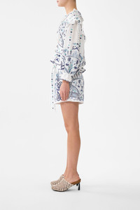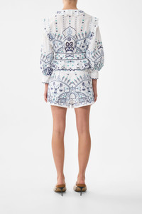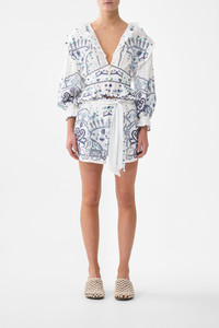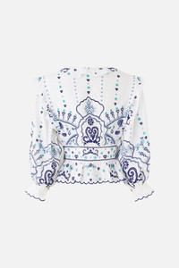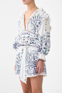 The All About That Lace V-Neck Blouse With Ruffle Details is a handcrafted linen silhouette designed by our in house artisans. Reimagined in an exclusive limited edition print, this blouse features a V neckline with a tie front closure. Blouson sleeves billow before tapering into tie cuffs, while a fitted waist defines the shape. Cascading ruffles and intricate embroidery add luxury layered detail. - 100% Linen - V Neck - Tie Front - Blouson Sleeve With Tie Cuff - Fitted Waist - Ruffle Details - Machine Embroidery SKU 00038510-ABOULACE-XS Fabric and Care 100% LINEN