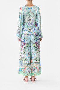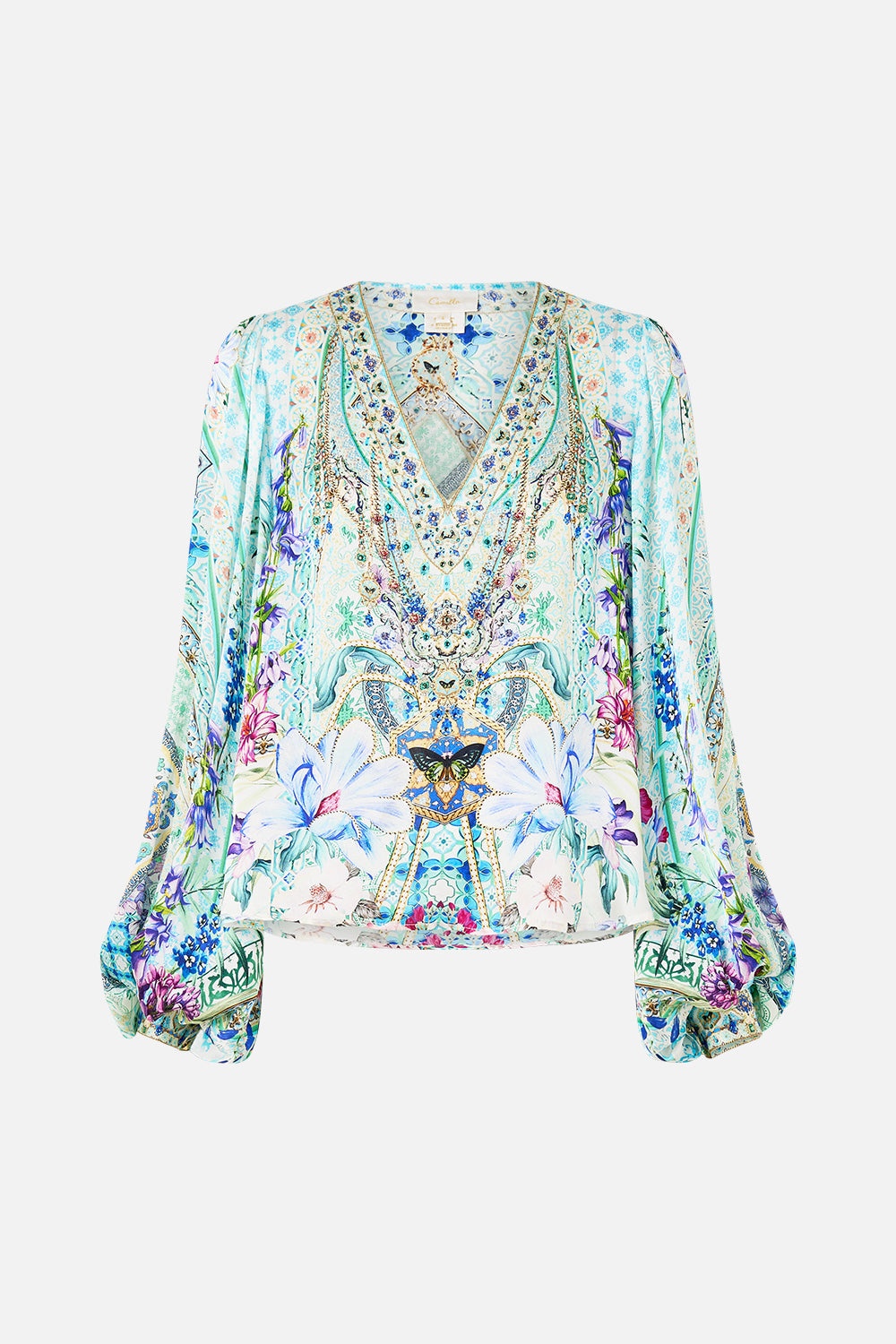 Designed in Australia, The Sunrise In Sintra V-Neck Blouson Sleeve Blouse celebrates lush gardens and eclectic nineteenth-century architecture, where light blues and intricate tiles reflect exotic motifs, inviting you into botanical beauty. Lovingly handcrafted, this gorgeous V-neck blouse features billowing blouson sleeves, button-up cuff detailing, and a relaxed fit, combining effortless elegance with refined tailoring. - V Neckline - Blouson Sleeve - Button Up Cuff Detail - Relaxed Fit - Non Sheer - Button Through Front SKU 00033957-SUNRSINT-XXS Fabric and Care 100% SILK Silk satin embodies a sumptuously smooth finish that offers a rich buttery touch to the skin. As a result of the satin weaving technique, it masterfully creates a fuller bounce to the body and drape details.