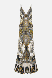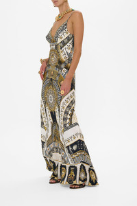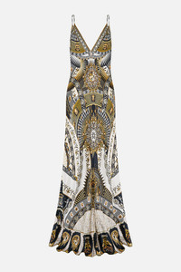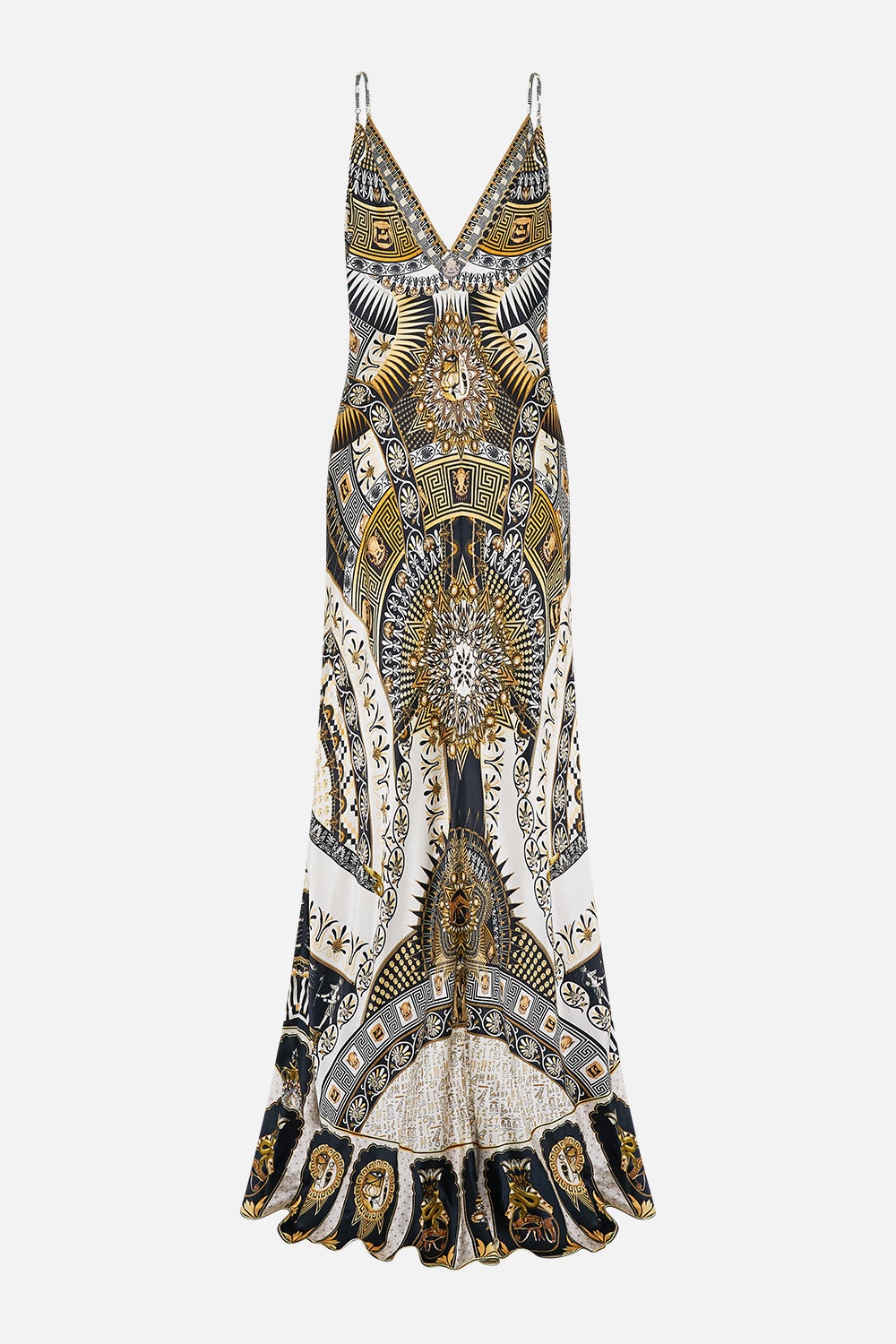 Designed in Australia, The Temples Of Dendara V Neck Long Bias Slip Dress With Train features borders and hieroglyphs, drawn from the sacred Temple of Dendara, enriched with bespoke CAMILLA motifs and divine representations of Hathor and her celestial consort, Horus. Lovingly handcrafted, this CAMILLA silk dress features a bias cut shape that skims beautifully across the curves of the body into a full-length hemline with a slight train detail upon the back. The deep V back neck and delicate adjustable shoulder straps exude unparalleled opulence. - Crystal Embellishment - Bust Darts - Rouleau Straps - Bias Cut SKU 00031724-TEMPDEND-XXS Size and Fit Our model wears a CAMILLA S and is 5'10 (178cm) tall. Her standard dress size is an AU 10. She has a 32in (83cm) bust, 35in (89.5cm) hips and a 25in (66cm) waist. Camilla S = AU10 / UK10 / US6 Fabric and Care 100% silk Silk satin embodies a sumptuously smooth finish that offers a rich buttery touch to the skin. As a result of the satin weaving technique, it masterfully creates a fuller bounce to the body and drape details.