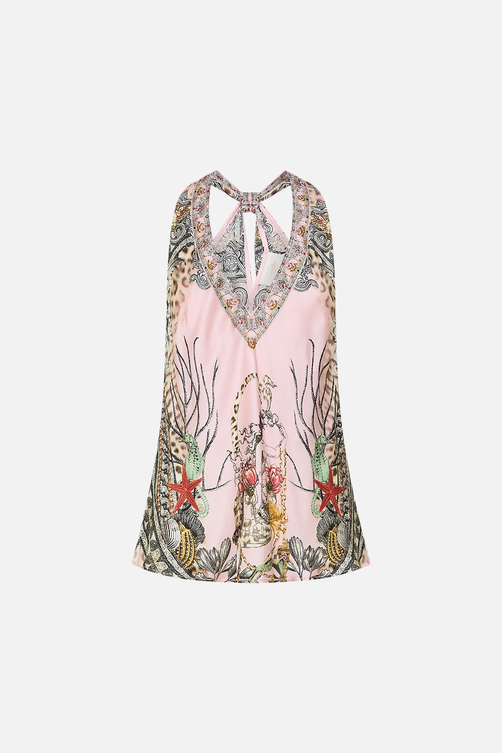 Designed in Australia, The Cave Of Wonders V Neck Top With Knot Back immerses you in the grandeur of classical civilisations with a majestic fusion of ancient archways, the enigmatic medusa, and delicate florals, adorned on a blush canvas. Lovingly handcrafted,, this is an effortlessly elegant silk top, this knot back tank features an open back split to create a relaxed fit throughout the body. Wear back to front as a cropped halter transforming the slit into a keyhole with tie front detail. - Crystal Embellishment - V Neck - Back Slit Detail - Racerback Knot Back Detail - Dropped Armhole SKU 00032075-CAVOWOND-XXS Size and Fit Our model wears a CAMILLA S and is 5'10 (178cm) tall. Her standard dress size is an AU 10. She has a 32in (83cm) bust, 35in (89.5cm) hips and a 25in (66cm) waist. Camilla S = AU10 / UK10 / US6 Designed and fitted true to size, take your normal size. Fabric and Care 100% SILK Silk satin embodies a sumptuously smooth finish that offers a rich buttery touch to the skin. As a result of the satin weaving technique, it masterfully creates a fuller bounce to the body and drape details.