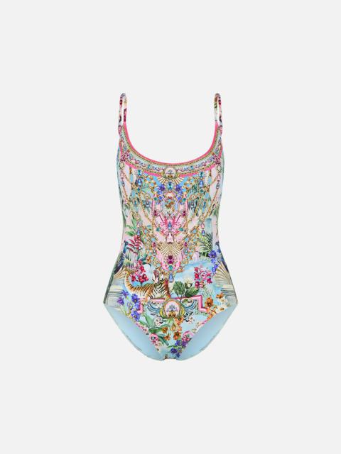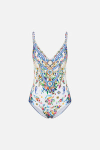 Designed in Australia, the Tiles Darls Wired V Neck One Piece reads the language of florals and tiles, blue and orange hues intertwine, a celebration of artisan hands and enduring beauty. Lovingly handcrafted, a decadent V neckline with underwire support and adjustable straps designed for a C-cup bust. Crystal embellishments add sparkle for pool side decadence. - To Fit C Cup - Underwire Support - Adjustable Straps - Crystal Embellishment SKU 00035525-TILEDARL-XS Fabric and Care MAIN: 82% REGENERATED POLYAMIDE, 18% ELASTANE ECONYL® is regenerated nylon, crafted from waste materials that would otherwise end up polluting our Mother Earth. Its beauty lies in its ability to be recycled, remoulded and ultimately reused time and time again. An infinitely recyclable product that keeps our planet looking beautiful, it opens the door to a circular fashion sphere.