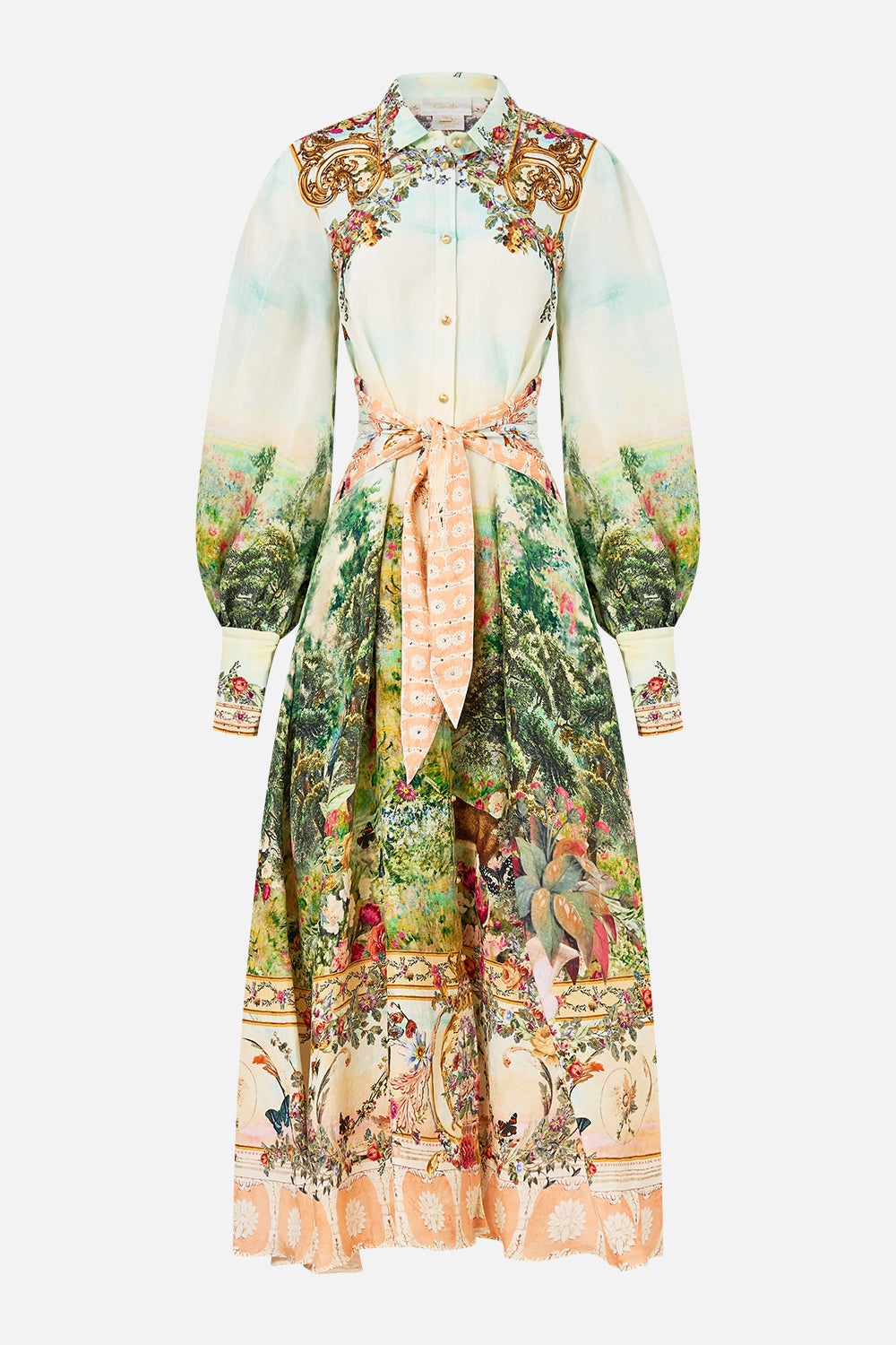 Designed in Australia, The Arches Of Amor Waist Tie Shirt Dress draws from the Palacio De Estoi, Portugal's "Pink Palace," echoing rococo charm, grand arches, intricate tiles, and romantic florals from Versailles-style gardens. Lovingly handcrafted, this elegant CAMILLA shirt dress showcases a sleek collar detail that flows into a button-through enclosure on a slightly relaxed fit straight silhouette across the body. Relaxed full-length sleeves are adorned with wide split cuffs that fall past the wrists to create a visually elongated line to this exquisite mini dress. - Tie Front - Button Through - Collar - Shirring At Back Waist - Crystal Embellishment - Midi Length - Non-Sheer SKU 00033883-ARCHAMOR-XXS Size and Fit Designed and fitted true to size, take your normal size Fabric and Care 80% LINEN,20% SILK Grown organically, this lightweight natural fibre offers a timeless aesthetic that adds durability and longevity to any wardrobe. Its breathability keeps your skin cool, minimises moisture and ensures effortless comfort.