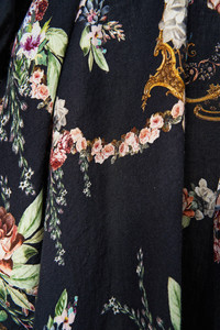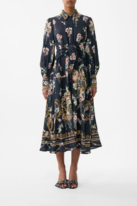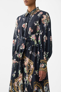 Designed in Australia, the Noble Endeavours Waist Tie Shirt Dress unveils a black base fused with florals and gilded arches, echoing the regal opulence of the Palace of Queluz—a poetic nod to throne rooms and the queen's dressing sanctuary. Lovingly handcrafted, this elegant CAMILLA shirt dress showcases a sleek collar detail that flows into a button-through enclosure on a slightly relaxed fitting straight silhouette across the body. Relaxed full-length sleeves are adorned with wide split cuffs that fall past the wrists to create a visually elongated line to this exquisite mini dress. - Fitted At Waist With Flare Skirt - Midi Length - Tie Front Waist - Button Through Front - Midi Length SKU 00039664-NOBLENDE-XXS Size and Fit Our model wears a CAMILLA S and is 5'10 (178cm) tall. Her standard dress size is an AU 10. She has a 32in (83cm) bust, 35in (89.5cm) hips and a 25in (66cm) waist. Camilla S = AU10 / UK10 / US6 Designed and fitted true to size, take your normal size. Fabric and Care 100% LINEN Made from flax fibres, this lightweight natural fibre offers a timeless aesthetic that adds durability and longevity to any wardrobe. Its breathability keeps your skin cool, minimises moisture and ensures effortless comfort.