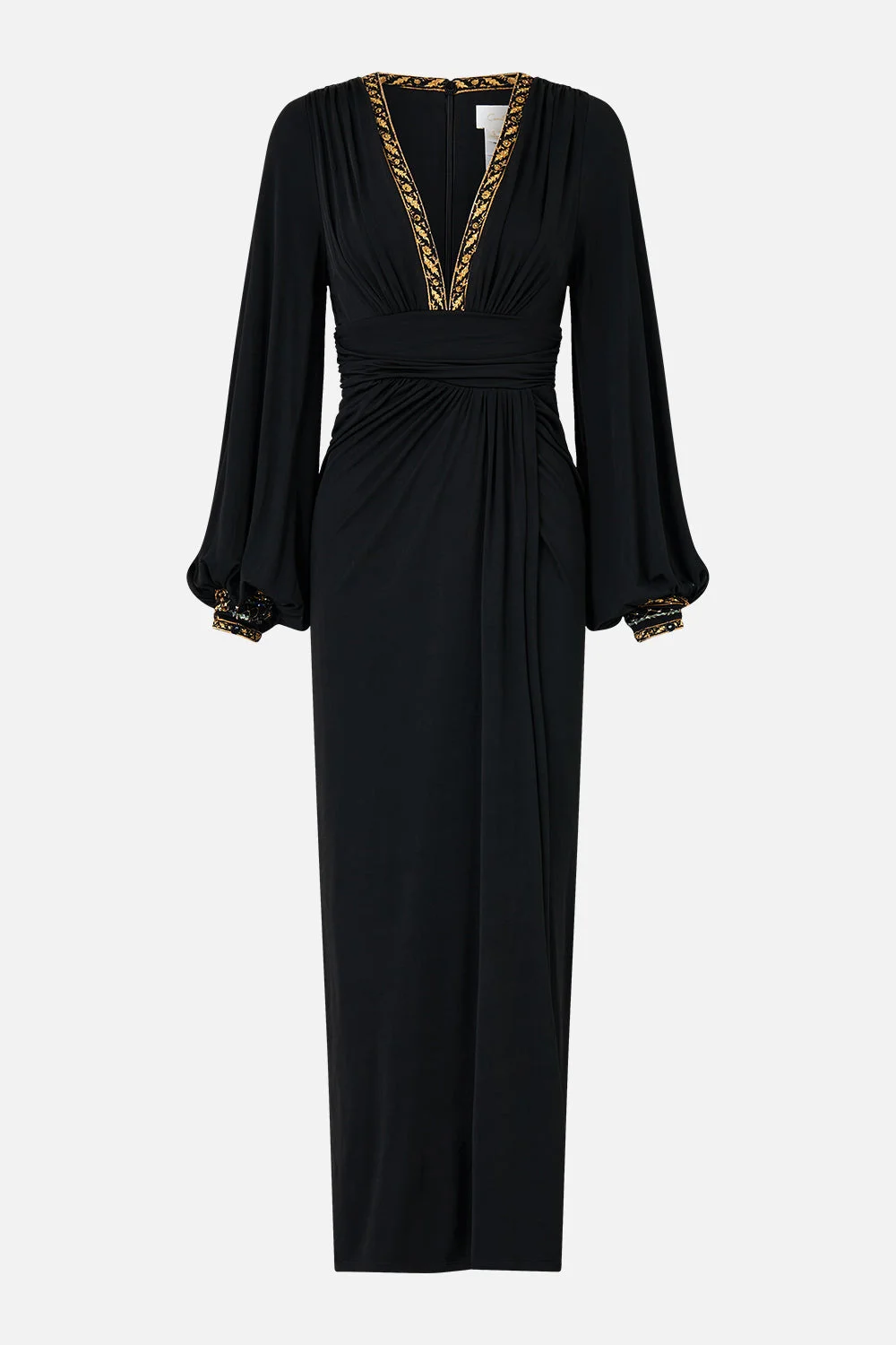 The Ottoman Elegance Waisted Draped Jersey Dress is a handcrafted silhouette designed by our in house artisans. Reimagined in an exclusive limited edition print, our maxi jersey dress features a draped and gathered band that contours the waist. Blouson sleeves add soft structure and effortless movement. - Slim Fit - Fitted Gathered Waistband - Long Draped Dress - Blouson Sleeve SKU 00036702-OTTOELEG-XS Size and Fit Our model is 5'10 (178cm) tall and wears a size S (AU 10). Bust: 40in (101.6cm) Waist: 26.5in (67cm) Hips: 38in (96.5cm) Fabric and Care 92% VISCOSE 8% ELASTANE Viscose is a fibre crafted from the natural substance, cellulose, known for its softness, breathability and drape. It possesses a subtle sheen and is perfect for lightweight soft tailored silhouettes or more structured styles in heavier weights.