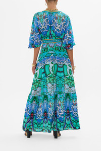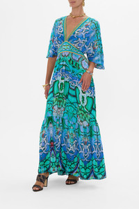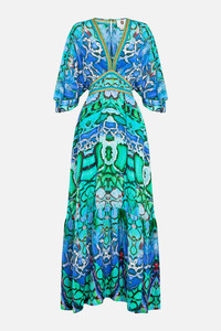 Land of Wonder is an exclusive heritage print, reimagined to mark 20 Years of CAMILLA. Designed in Australia, The Land Of Wonder Waisted Dress With Hem Ruffle embodies a mystical fusion of snakeskin and oceanic hues, celebrating the art of rebirth and reinvention. Lovingly handcrafted, this luxury CAMILLA silk maxi dress features a blousy bodice that cinches into the adjustable waistband. The softly gathered skirt flows from the waistband to create a flowy silhouette accentuated with a deep ruffle hemline. - Fitted At Waist With Flared Skirt - Full Length - Side Seam Pockets - Shaped Sleeves - Crystal Embellishment SKU 00036006-LANDWOND-XXS Size and Fit Our model wears a CAMILLA S and is 5'10 (178cm) tall. Her standard dress size is an AU 10. She has a 32in (83cm) bust, 35in (89.5cm) hips and a 25in (66cm) waist. Camilla S = AU10 / UK10 / US6 Fabric and Care 100% SILK With its subtly textured surface, silk crepe is our core fabrication made perfect for versatile wear. With its ability to hold alternative ways to wear, this decadent fabric drapes elegantly off the body whilst keeping you cool with its breathable nature.