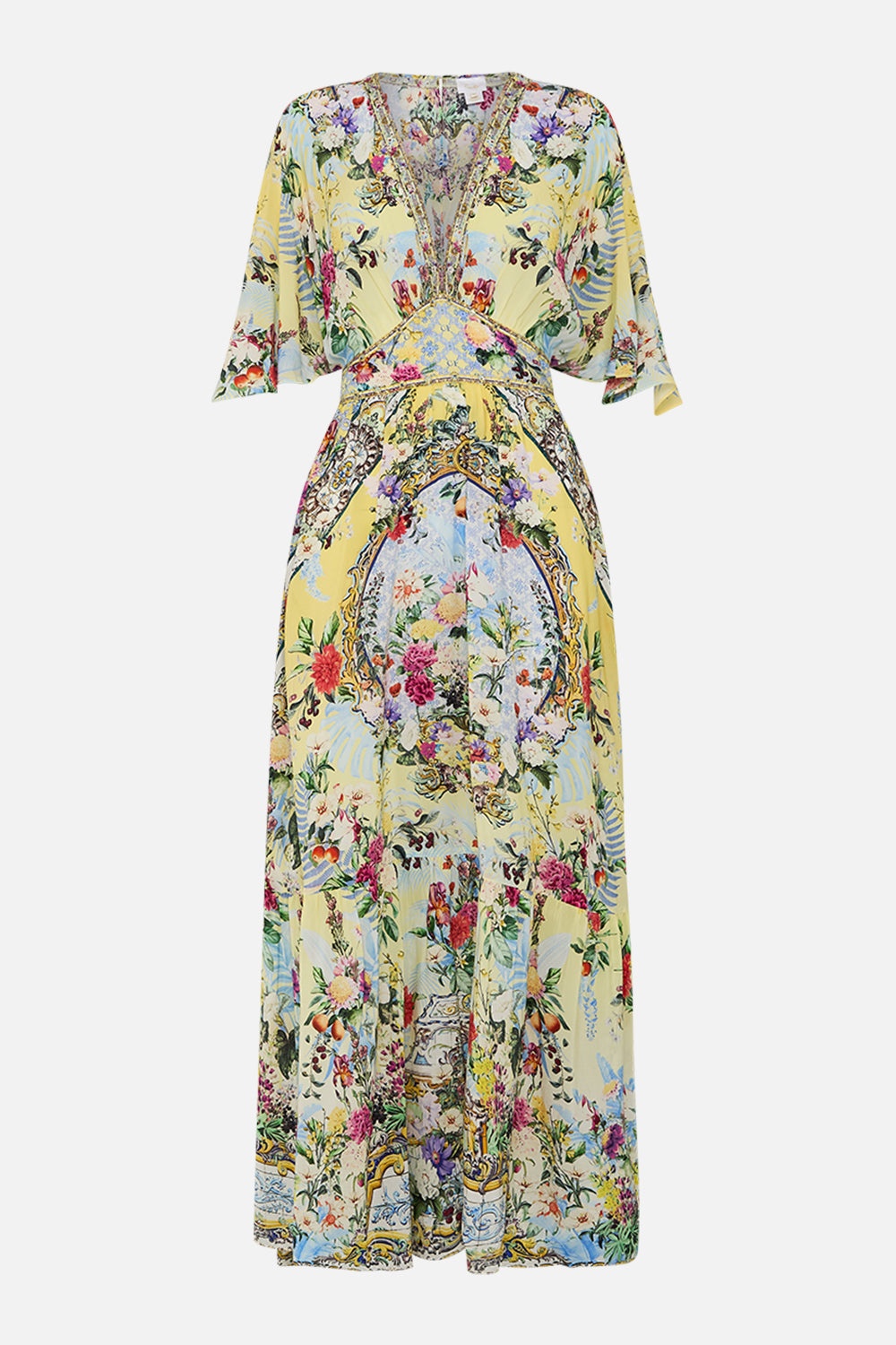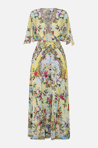 Designed in Australia, The Flor Fantastica Waisted Dress With Hem Ruffle echoes the splendour of Queluz Palace, soft yellow hues bloom amidst florals inspired by its lush gardens. A celebration of nature's elegance and timeless artistry. Lovingly handcrafted, this luxury CAMILLA silk maxi dress features a blousy bodice that cinches into the adjustable waistband. The softly gathered skirt flows from the waistband to create a flowy silhouette accentuated with a deep ruffle hemline. - Fitted At Waist With Flared Skirt - Full Length - Side Seam Pockets - Shaped Sleeves - Crystal Embellishment - Non-Sheer SKU 00033221-FLORFANT-XXS Size and Fit Designed as a relaxed fit, take your normal size or select one size smaller for a neater fit Fabric and Care 100% SILK With its subtly textured surface, silk crepe is our core fabrication made perfect for versatile wear. With its ability to hold alternative ways to wear, this decadent fabric drapes elegantly off the body whilst keeping you cool with its breathable nature.