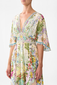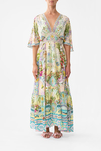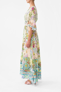 Designed in Australia, the Just Coasting Waisted Dress With Hem Ruffle radiates a kaleidoscope of pastel dreams, sunlit charm and coastal treasures inspired by boundless seaside reveries. Lovingly handcrafted, this luxury CAMILLA silk maxi dress features a blousy bodice that cinches into an adjustable waistband. The softly gathered skirt drops from the waistband to create a flowy silhouette accentuated with a deep ruffle hemline. - Fitted Waist With Flared Skirt - Full Length - Side Seam Pockets - Shaped Sleeves - Fitted Silhouette SKU 00035362-JUSTCOAS-XXS Size and Fit Our model wears a CAMILLA S and is 5'10 (178cm) tall. Her standard dress size is an AU 10. She has a 32in (83cm) bust, 35in (89.5cm) hips and a 25in (66cm) waist. Camilla S = AU10 / UK10 / US6 Designed as a relaxed fit—take your normal size, or select one size smaller for a neater fit. Fabric and Care SELF-100% SILK CONTRAST -100% SILK With its subtly textured surface, silk crepe is our core fabrication made perfect for versatile wear. With its ability to hold alternative ways to wear, this decadent fabric drapes elegantly off the body whilst keeping you cool with its breathable nature.
