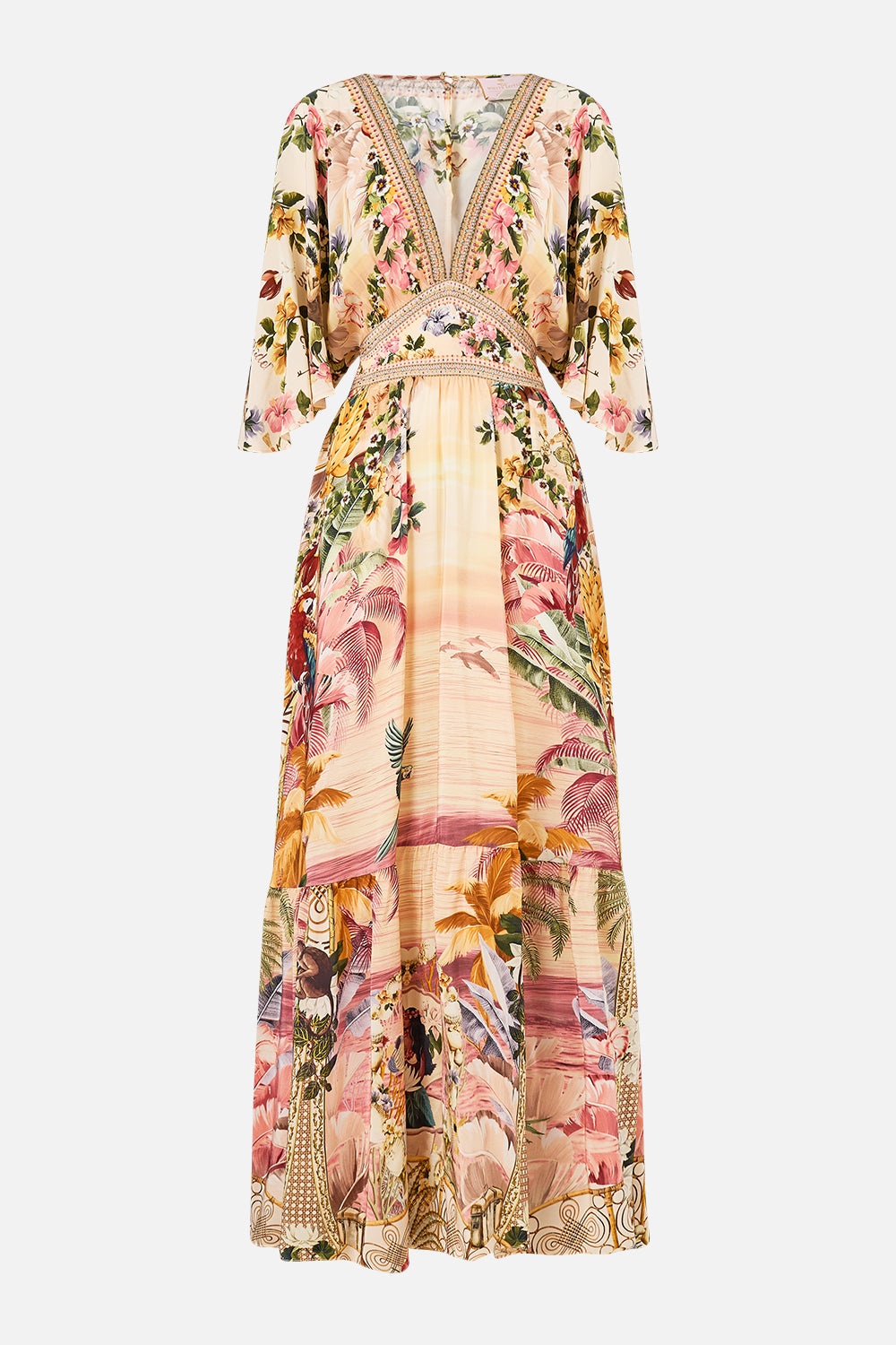 Designed in Australia, The Welcome To The White Lotus Waisted Dress With Hem Ruffle invites you to the CAMILLA x White Lotus Collaboration, where luscious sunset reveries and precious secrets collide in a decadent realm of mystery and wayfare. Lovingly handcrafted, this luxury CAMILLA silk maxi dress features a blousy bodice that cinches into the adjustable waistband. The softly gathered skirt flows from the waistband to create a flowy silhouette accentuated with a deep ruffle hemline. - Fitted At Waist With Flared Skirt - Full Length - Side Seam Pockets - Shaped Sleeves - Crystal Embellishment SKU 00037944-HAWAIISH-XXS Size and Fit Designed as a relaxed fit, take your normal size or select one size smaller for a neater fit Fabric and Care 100% SILK With its subtly textured surface, silk crepe is our core fabrication made perfect for versatile wear. With its ability to hold alternative ways to wear, this decadent fabric drapes elegantly off the body whilst keeping you cool with its breathable nature.