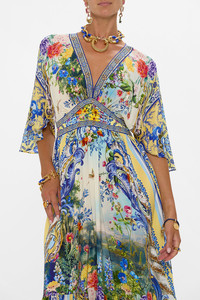 Designed in Australia, The Wall To Wall Wonders Waisted Dress With Hem Ruffle captures the grandeur of Queluz Palace, with soft blues and golden yellows of Azulejo tiles, blending history and artistry in a panoramic view of Portugal’s timeless beauty. Lovingly handcrafted, this luxury CAMILLA silk maxi dress features a blousy bodice that cinches into the adjustable waistband. The softly gathered skirt flows from the waistband to create a flowy silhouette accentuated with a deep ruffle hemline. - Cinched Waist With Flared Skirt - Full Length - Side Seam Pockets - Shaped Sleeves - Non-Sheer - Fitted Silhouette SKU 00033114-WALLWOND-XXS Size and Fit Designed as a relaxed fit, take your normal size or select one size smaller for a neater fit Fabric and Care SELF:100% SILK CONTRAST:100% SILK With its subtly textured surface, silk crepe is our core fabrication made perfect for versatile wear. With its ability to hold alternative ways to wear, this decadent fabric drapes elegantly off the body whilst keeping you cool with its breathable nature.