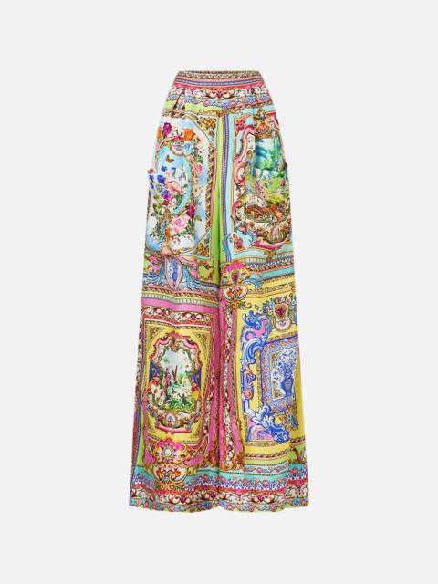 Designed in Australia, the Spirit Of Santa Maria Wide Leg Trouser With Front Pockets celebrates the vivid contrasts of Igreja Matriz De Santa Maria. Painterly prints reflect its dynamic artistry, steeped in timeless energy and colour. Lovingly handcrafted, this luxury CAMILLA silk pant features a relaxed wide leg silhouette upon the high waistline. The adjustable waistband and patch pocket details exude effortless wearability. - Relaxed Fit - Full Length - Elasticated Waist - Crystal Embellishment SKU 00035440-SPIRMARI-XXS Size and Fit Designed as a relaxed fit—take your normal size, or select one size smaller for a neater fit. Fabric and Care 100% SILK Silk twill is renowned for its diagonally-patterned weave and fluid texture. Its high thread count ensures rich density and durability, while its beautiful sheen provides a luscious touch to the skin.