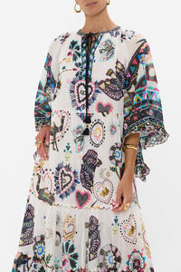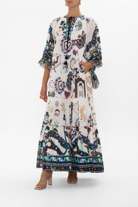 Designed in Australia, The Nubian Wonderland Wide Sleeve Gathered Dress awakens the identity and artistry amidst the Nubian Village with accenting contrasts, vivid embroidery and geometric depictions. Lovingly handcrafted, this luxury maxi dress features a relaxed full length silhouette with a cascade of tiered panels throughout the drop waistline and flared skirt. The poetic billow of this dress is complimented with flared raglan sleeves finished with elegant ruffled hems. - Relaxed Fit - Full Length - Raglan Sleeve With Ruffle Detail - Neck Tie With Bespoke Camilla Tassel Charms - Crystal Embellishment - Embroidery Detail SKU 00031775-NUBINWON-XXS Size and Fit Our model wears a CAMILLA S and is 5'10 (178cm) tall. Her standard dress size is an AU 10. She has a 32in (83cm) bust, 35in (89.5cm) hips and a 25in (66cm) waist. Camilla S = AU10 / UK10 / US6 Designed as a relaxed fit, take your normal size or select one size smaller for a neater fit Fabric and Care 100%COTTON Cotton voile is an often opaque lightweight fabric. With a natural texture, it holds its shape gracefully and is perfect for creating gathered luxurious and billowing silhouettes.